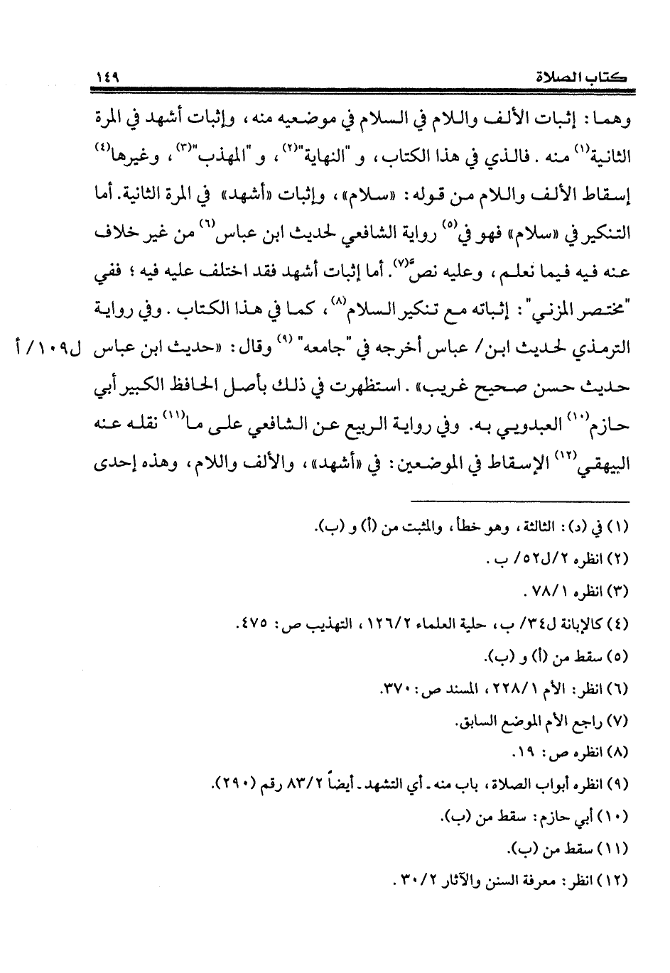 وهما: إثبات الألف واللام في السلام في موضعيه منه، وإثبات أشهد في المرة الثانية (¬1) منه. فالذي في هذا الكتاب، و"النهاية" (¬2)، و"المهذب" (¬3)، وغيرها (¬4) إسقاط الألف واللام من قوله: "سلام"، وإثبات "أشهد" في المرة الثانية. أما التنكير في "سلام" فهو في (¬5) رواية الشافعي لحديث ابن عباس (¬6) من غير خلاف عنه فيه فيما نعلم، وعليه نصَّ (¬7). أما إثبات أشهد فقد اختلف عليه فيه؛ ففي "مختصر المزني": إثباته مع تنكير السلام (¬8)، كما في هذا الكتاب. وفي رواية الترمذي لحديث ابن عباس أخرجه في "جامعه" (¬9) وقال: "حديث ابن عباس حديث حسن صحيح غريب". استظهرت في ذلك بأصل الحافظ الكبير أبي حازم (¬10) العبدويي به. وفي رواية الربيع عن الشافعي على ما (¬11) نقله عنه البيهقي (¬12) الإسقاط في الموضعين: في "أشهد"، والألف واللام، وهذه إحدى