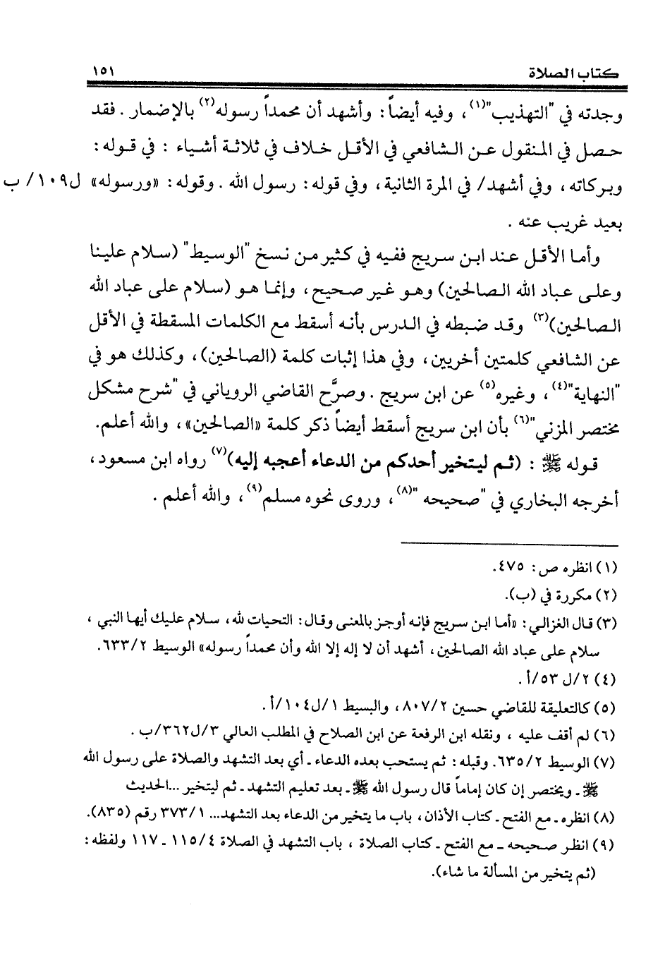 وأما الأقل عند ابن سريج ففيه في كثير من نسخ "الوسيط" (سلام علينا وعلى عباد الله الصالحين) وهو غير صحيح، وإنما هو (سلام على عباد الله الصالحين) (¬3) وقد ضبطه في الدرس بأنه أسقط مع الكلمات المسقطة في الأقل عن الشافعي كلمتين أخريين، وفي هذا إثبات كلمة (الصالحين)، وكذلك هو في "النهاية" (¬4)، وغيره (¬5) عن ابن سريج. وصرَّح القاضي الروياني في "شرح مشكل مختصر المزني" (¬6) بأن ابن سريج أسقط أيضاً ذكر كلمة "الصالحين"، والله أعلم.