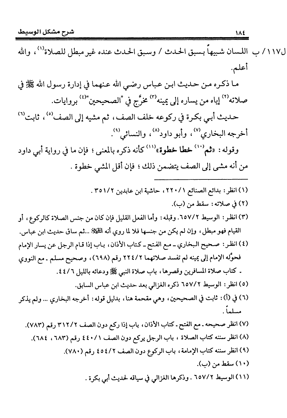(¬3) انظر: الوسيط 2/ 657. وقبله: وأما الفعل القليل فإن كان من جنس الصلاة كالركوع، أو القيام فهو مبطل، وإن لم يكن من جنسها فلا لما روي أنه - عليه السلام - ... ثم ساق حديث ابن عباس.