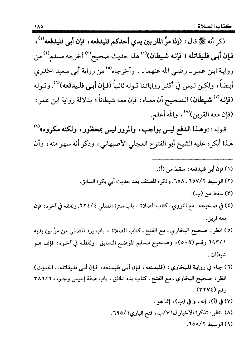 (¬5) انظر: صحيح البخاري - مع الفتح - كتاب الصلاة، باب يرد المصلي من مرَّ بين يديه 1/ 693 رقم (509)، وصحيح مسلم الموضع السابق. ولفظه في آخره: فإنما هو شيطان.