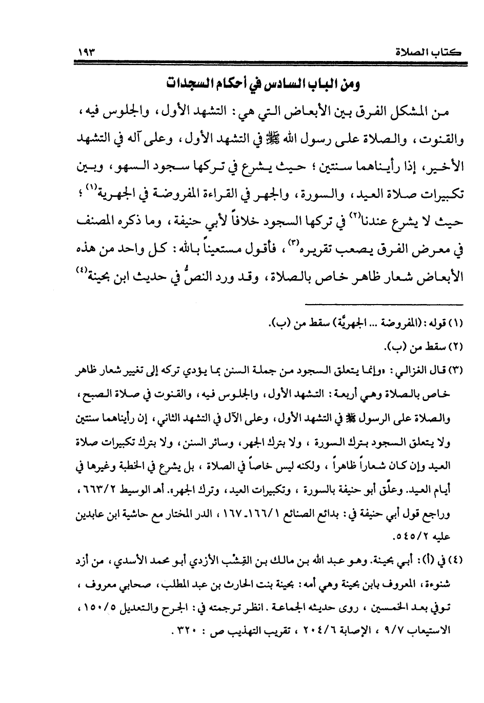 (¬3) قال الغزالي: "وإنما يتعلق السجود من جملة السنن بما يؤدي تركه إلى تغيير شعار ظاهر خاص بالصلاة وهي أربعة: التشهد الأول، والجلوس فيه، والقنوت في صلاة الصبح، والصلاة على الرسول - صلى الله عليه وسلم - في التشهد الأول، وعلى الآل في التشهد الثاني، إن رأيناهما سنتين ولا يتعلق السجود بترك السورة، ولا بترك الجهر، وسائر السنن، ولا بترك تكبيرات صلاة العيد وإن كان شعاراً ظاهراً، ولكنه ليس خاصاً في الصلاة، بل يشرع في الخطبة وغيرها في أيام العيد. وعلَّق أبو حنيفة بالسورة، وتكبيرات العيد، وترك الجهر". أهـ الوسيط 2/ 663، وراجع قول أبي حنيفة في: بدائع الصنائع 1/ 166 - 167، الدر المختار مع حاشية ابن عابدين عليه 2/ 545.