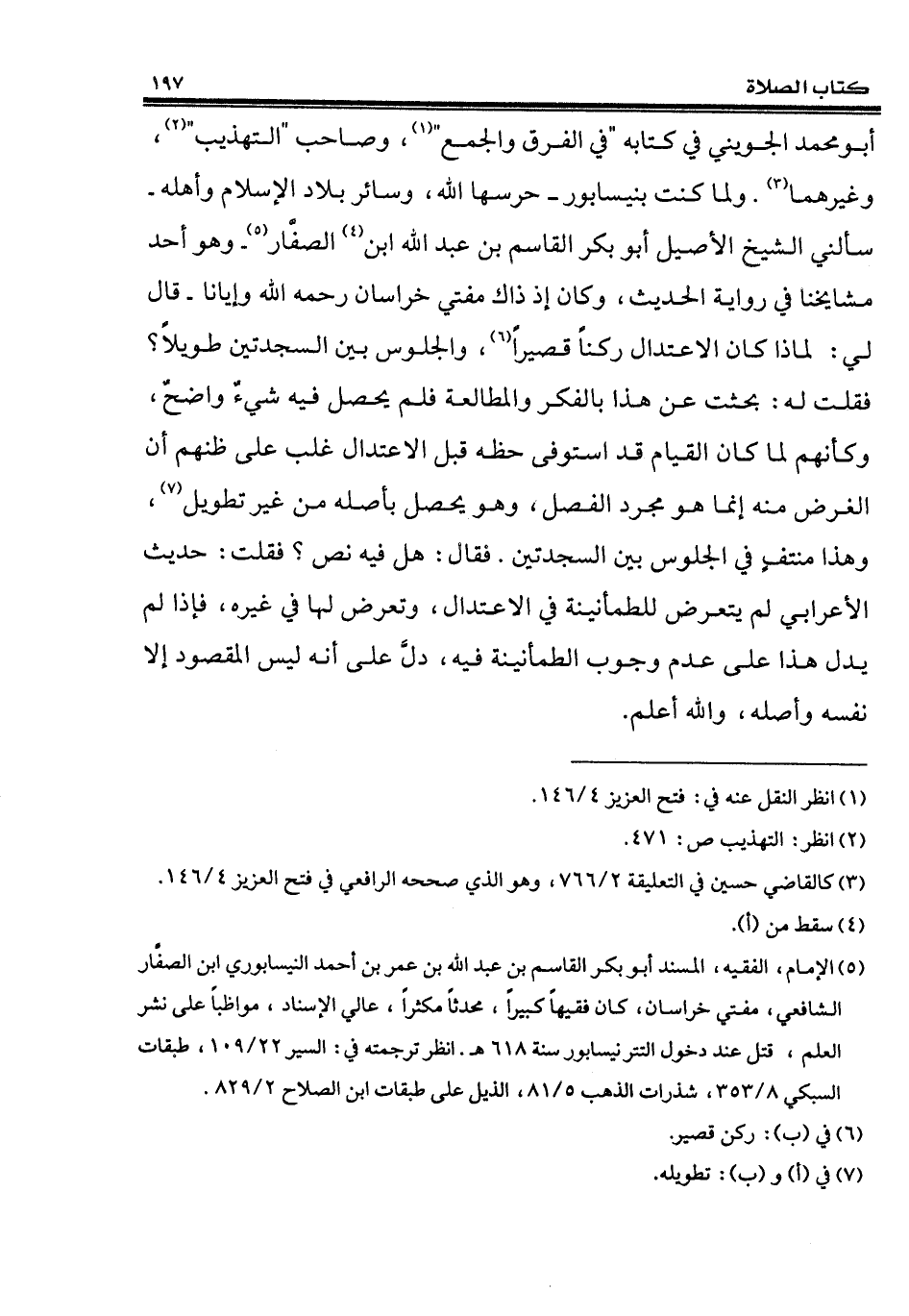 أبو محمد الجويني في كتابه "في الفرق والجمع" (¬1)، وصاحب "التهذيب" (¬2)، وغيرهما (¬3). ولما كنت بنيسابور - حرسها الله، وسائر بلاد الإسلام وأهله - سألني الشيخ الأصيل أبو بكر القاسم بن عبد الله ابن (¬4) الصفَّار (¬5) - وهو أحد مشايخنا في رواية الحديث، وكان إذ ذاك مفتي خراسان رحمه الله وإيانا - قال لي: لماذا كان الاعتدال ركناً قصيراً (¬6)، والجلوس بين السجدتين طويلاً؟ فقلت له: بحثت عن هذا بالفكر والمطالعة فلم يحصل فيه شيءٌ واضحٌ، وكأنهم لما كان القيام قد استوفى حظه قبل الاعتدال غلب على ظنهم أن الغرض منه إنما هو مجرد الفصل، وهو يحصل بأصله من غير تطويل (¬7)، وهذا منتفٍ في الجلوس بين السجدتين. فقال: هل فيه نص؟ فقلت: حديث الأعرابي لم يتعرض للطمانينة في الاعتدال، وتعرض لها في غيره، فإذا لم يدل هذا على عدم وجوب الطمأنينة فيه، دلَّ على أنه ليس المقصود إلا نفسه وأصله، والله أعلم.