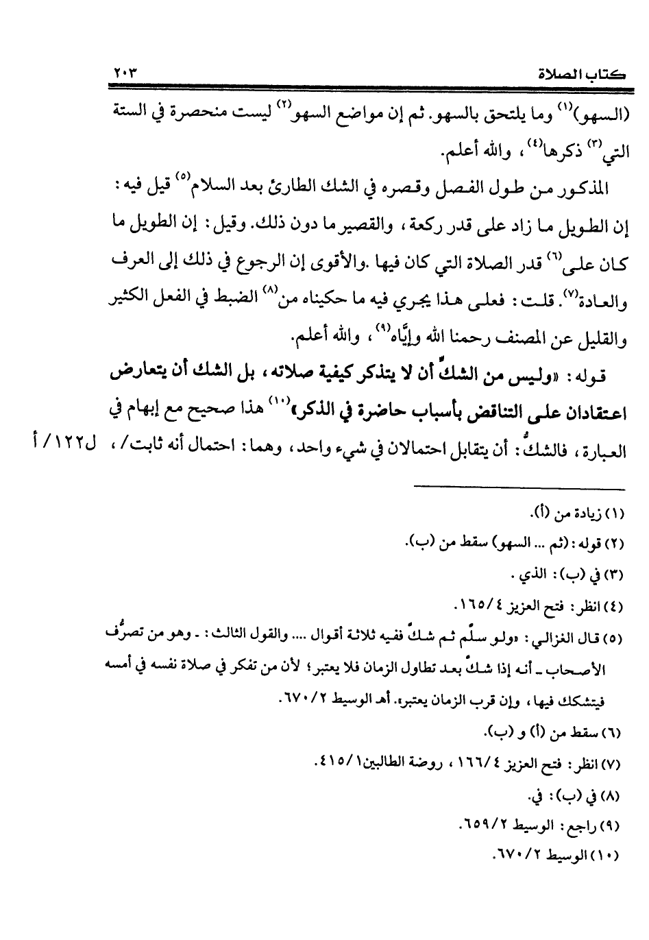 (¬5) قال الغزالي: "ولو سلَّم ثم شكَّ ففيه ثلاثة أقوال ... والقول الثالث: - وهو من تصرُّف الأصحاب - أنه إذا شكَّ بعد تطاول الزمان فلا يعتبر؛ لأن من تفكر في صلاة نفسه في أمسه فيتشكك فيها، وإن قرب الزمان يعتبر". أهـ الوسيط 2/ 670.