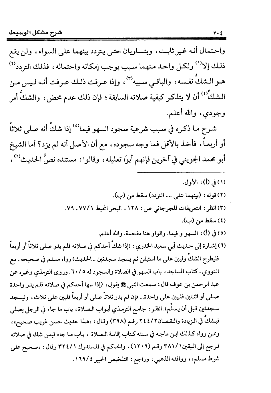 (¬6) إشارة إلى حديث أبي سعيد الخدري: (إذا شكَّ أحدكم في صلاته فلم يدر صلى ثلاثاً أو أربعاً فليطرح الشكَّ وليبن على ما استيقن ثم يسجد سجدتين ... الحديث) رواه مسلم في صحيحه - مع النووي - كتاب المساجد، باب السهو في الصلاة والسجود له 5/ 60. وروى الترمذي وغيره عن عبد الرحمن بن عوف قال: سمعت النبي - صلى الله عليه وسلم - يقول: (إذا سها أحدكم في صلاته فلم يدر واحدة صلى أو اثنتين فليبن علي واحدة ... فإن لم يدر ثلاثاً صلى أو أربعاً فليبن علي ثلاث، وليسجد سجدتين قبل أن يسلَّم). انظر: جامع الترمذي أبواب الصلاة، باب ما جاء في الرجل يصلي فيشكُّ في الزيادة والنقصان 2/ 244 رقم (398) وقال: "هذا حديث حسن غريب صحيح"، وممن رواه كذلك ابن ماجه في سننه كتاب إقامة الصلاة، باب ما جاء فيمن شك في صلاته فرجع إلى اليقين 1/ 381 رقم (1209)، والحاكم في المستدرك 1/ 324 وقال: "صحيح على شرط مسلم"، ووافقه الذهبي، راجع: التلخيص الحبير 4/ 169.