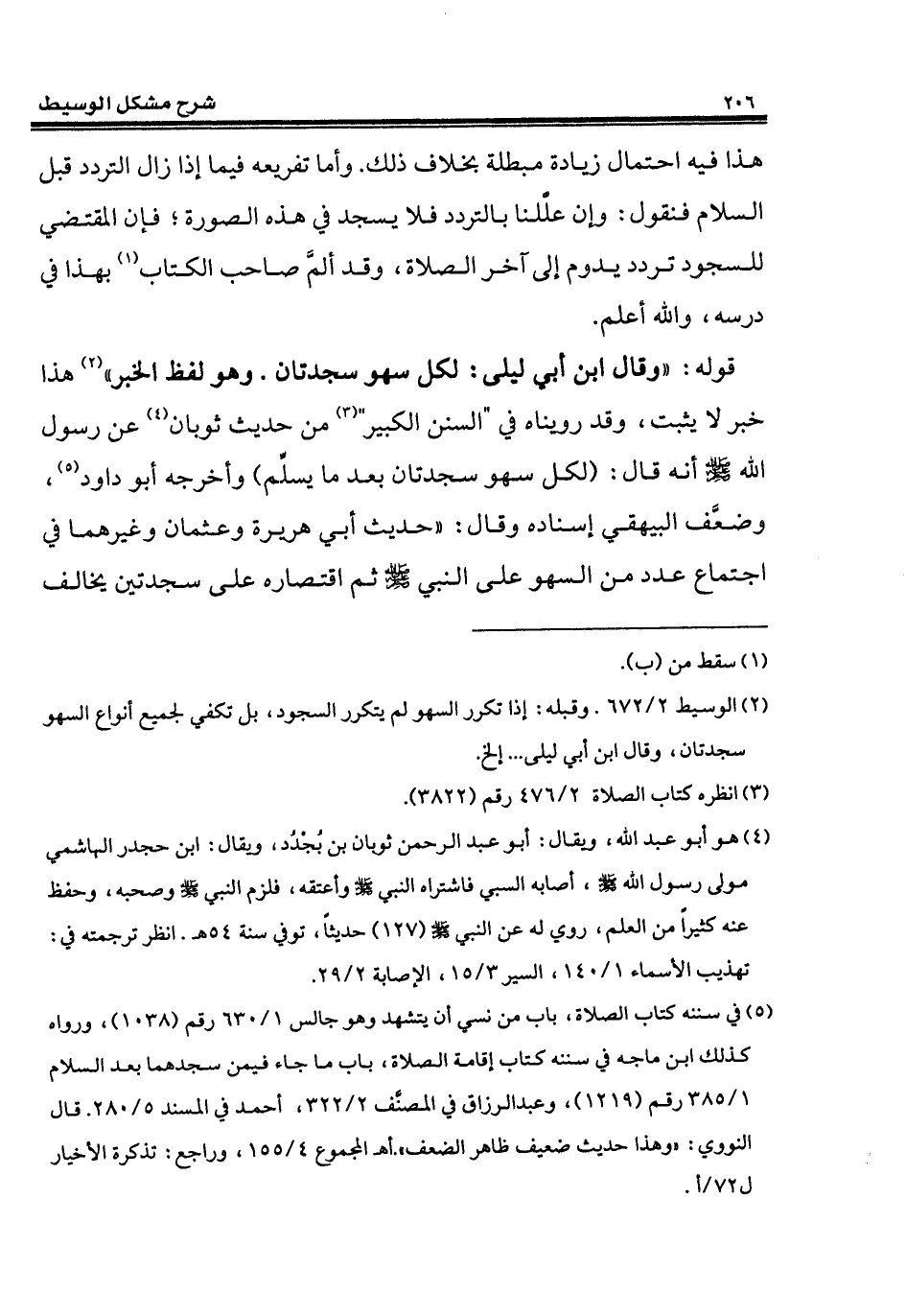 (¬2) الوسيط 2/ 672. وقبله: إذا تكرر السهو لم يتكرر السجود، بل تكفي لجميع أنواع السهو سجدتان، وقال ابن أبي ليلى ... إلخ.