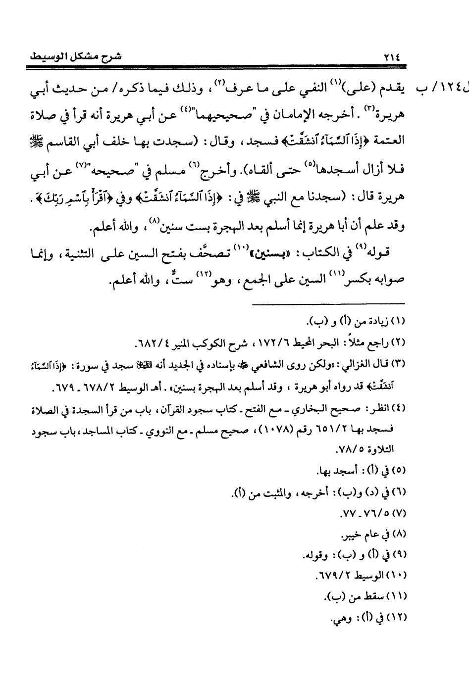 (¬3) قال الغزالي: "ولكن روى الشافعي - رضي الله عنه - بإسناده في الجديد أنه - عليه السلام - سجد في سورة: {إِذَا السَّمَاءُ انْشَقَّتْ} قد رواه أبو هريرة، وقد أسلم بعد الهجرة بسنين". أهـ الوسيط 2/ 678 - 679.