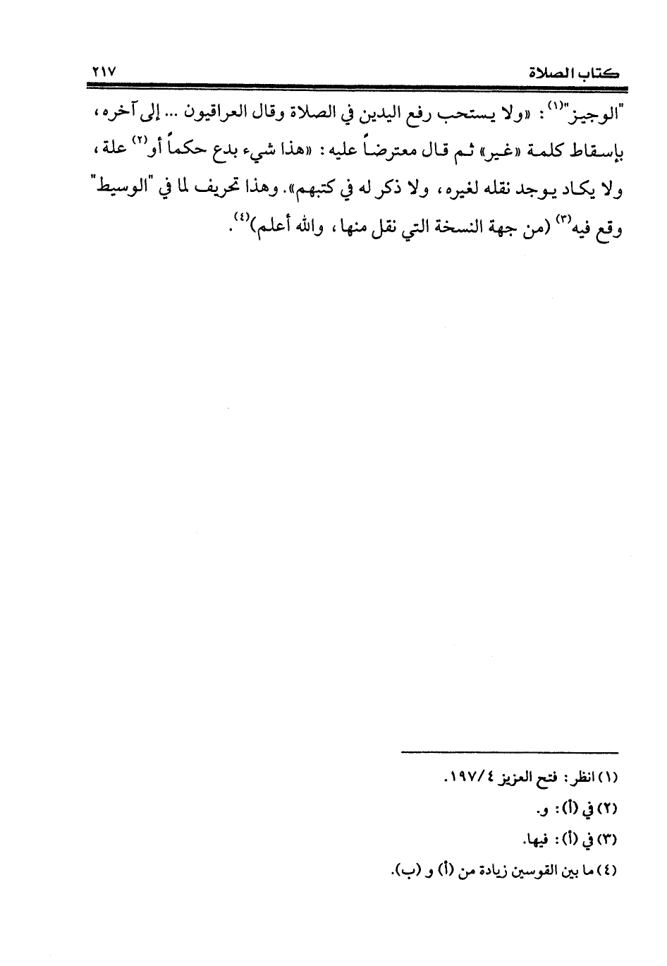 "الوجيز" (¬1): "ولا يستحب رفع اليدين في الصلاة وقال العراقيون ... إلى آخره، بإسقاط كلمة "غير" ثم قال معترضاً عليه: "هذا شيء بدع حكماً أو (¬2) علة، ولا يكاد يوجد نقله لغيره، ولا ذكر له في كتبهم". وهذا تحريف لما في "الوسيط" وقع فيه (¬3) (من جهة النسخة التي نقل منها، والله أعلم) (¬4).