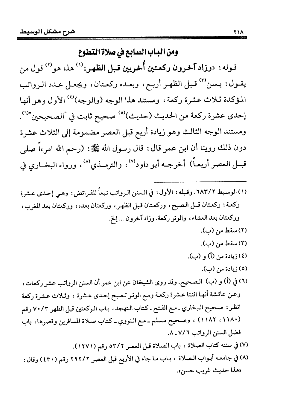 (¬1) الوسيط 2/ 683. وقبله: الأول: في السنن الرواتب تبعاً للفرائض: وهي إحدى عشرة ركعة: ركعتان قبل الصبح، وركعتان قبل الظهر، وركعتان بعده، وركعتان بعد المغرب، وركعتان بعد العشاء، والوتر ركعة. وزاد آخرون ... إلخ.
