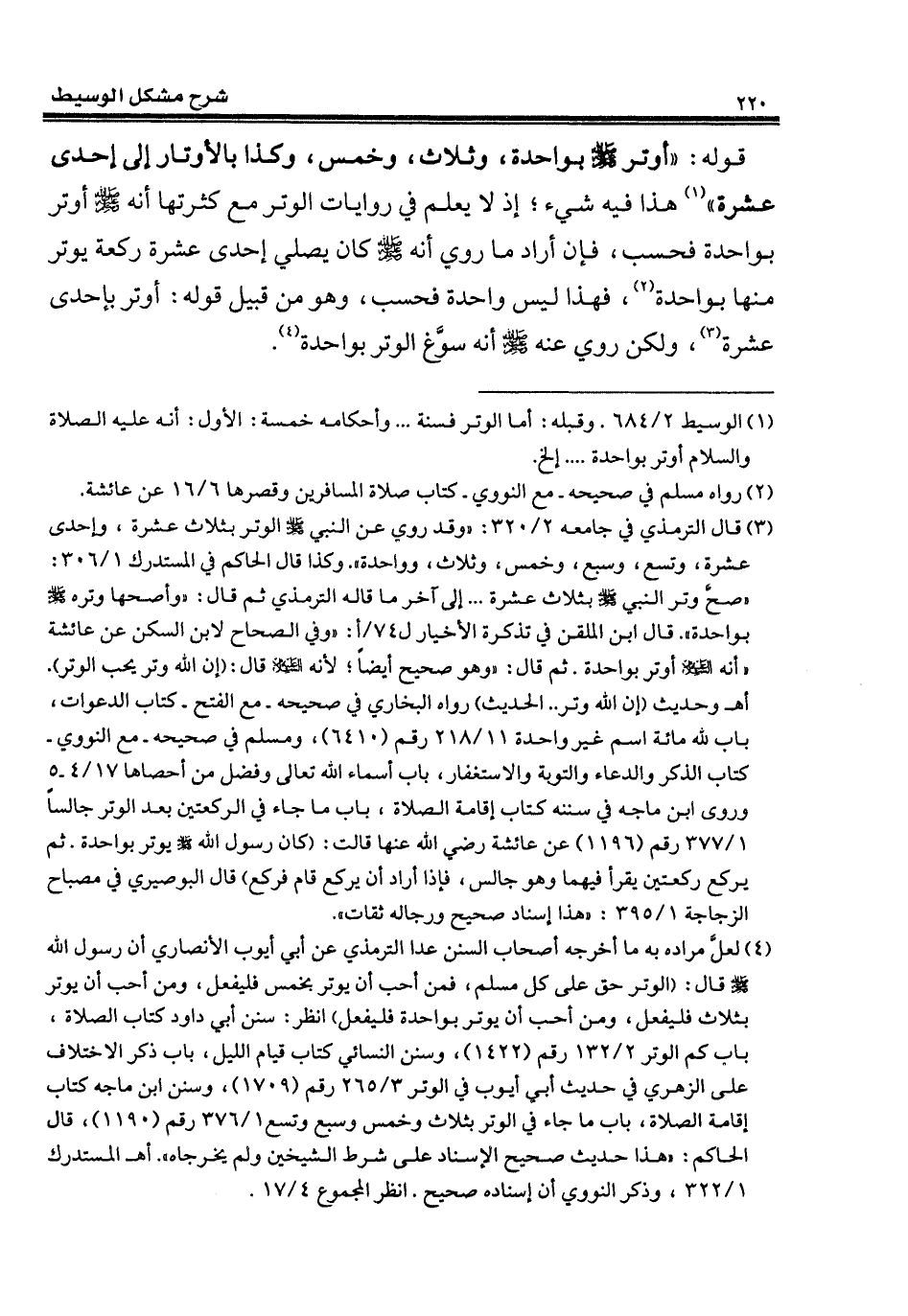 (¬1) الوسيط 2/ 684. وقبله: أما الوتر فسنة ... وأحكامه خمسة: الأول: أنه عليه الصلاة والسلام أوتر بواحدة ... إلخ.