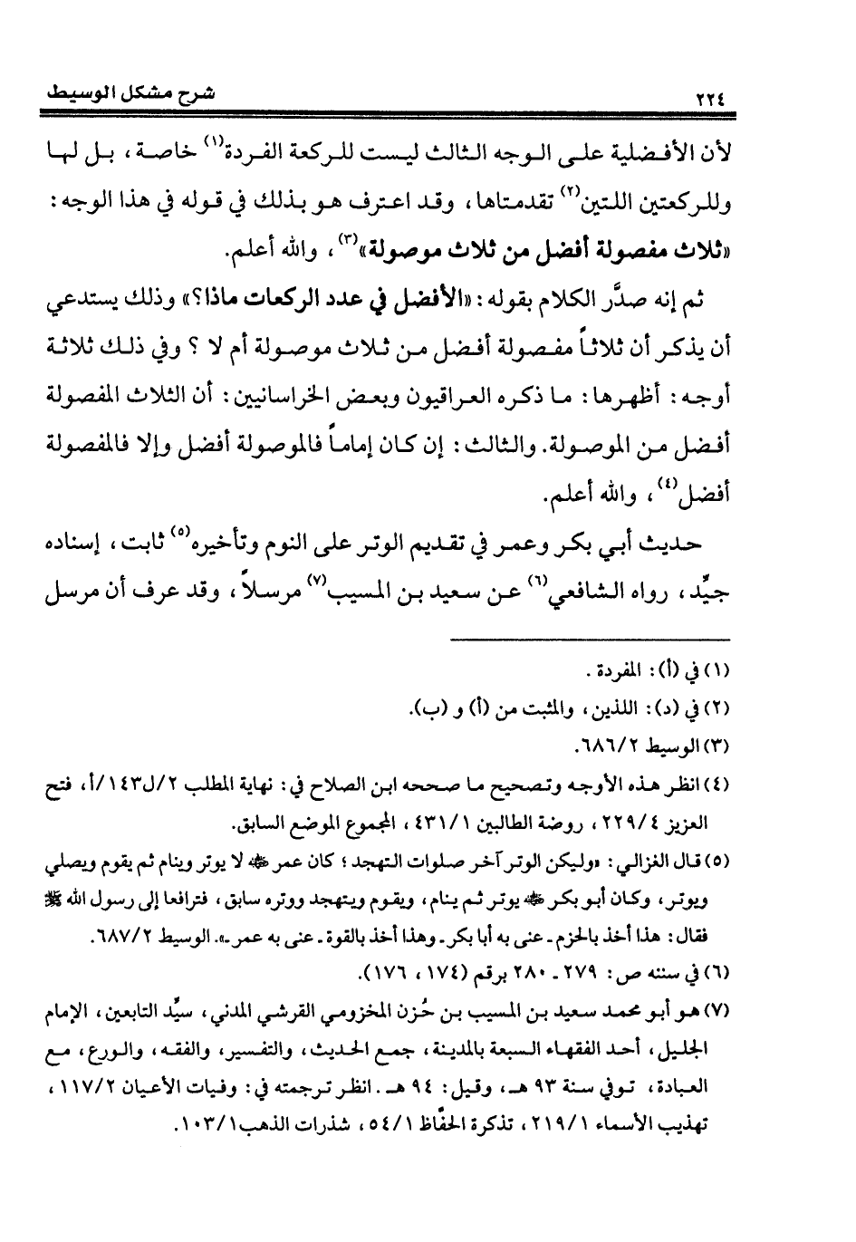 (¬5) قال الغزالي: "وليكن الوتر آخر صلوات التهجد؛ كان عمر - رضي الله عنه - لا يوتر وينام ثم يقوم ويصلي ويوتر، وكان أبو بكر - رضي الله عنه - يوتر ثم ينام، ويقوم ويتهجد ووتره سابق، فترافعا إلى رسول الله - صلى الله عليه وسلم - فقال: هذا أخذ بالحزم - عنى به أبا بكر - وهذا أخذ بالقوة - عنى به عمر -". الوسيط 2/ 687.