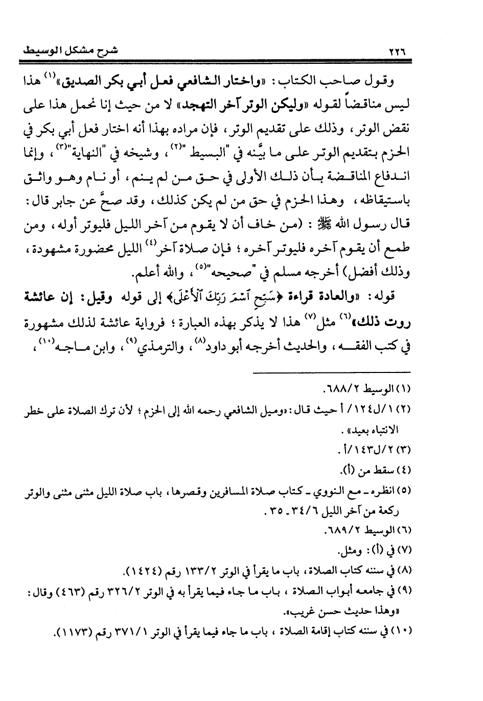 قوله: "والعادة قراءة {سَبِّحِ اسْمَ رَبِّكَ الْأَعْلَى} إلى قوله وقيل: إن عائشة روت ذلك" (¬6) مثل (¬7) هذا لا يذكر بهذه العبارة؛ فرواية عائشة لذلك مشهورة في كتب الفقه، والحديث أخرجه أبو داود (¬8)، والترمذي (¬9)، وابن ماجه (¬10)،