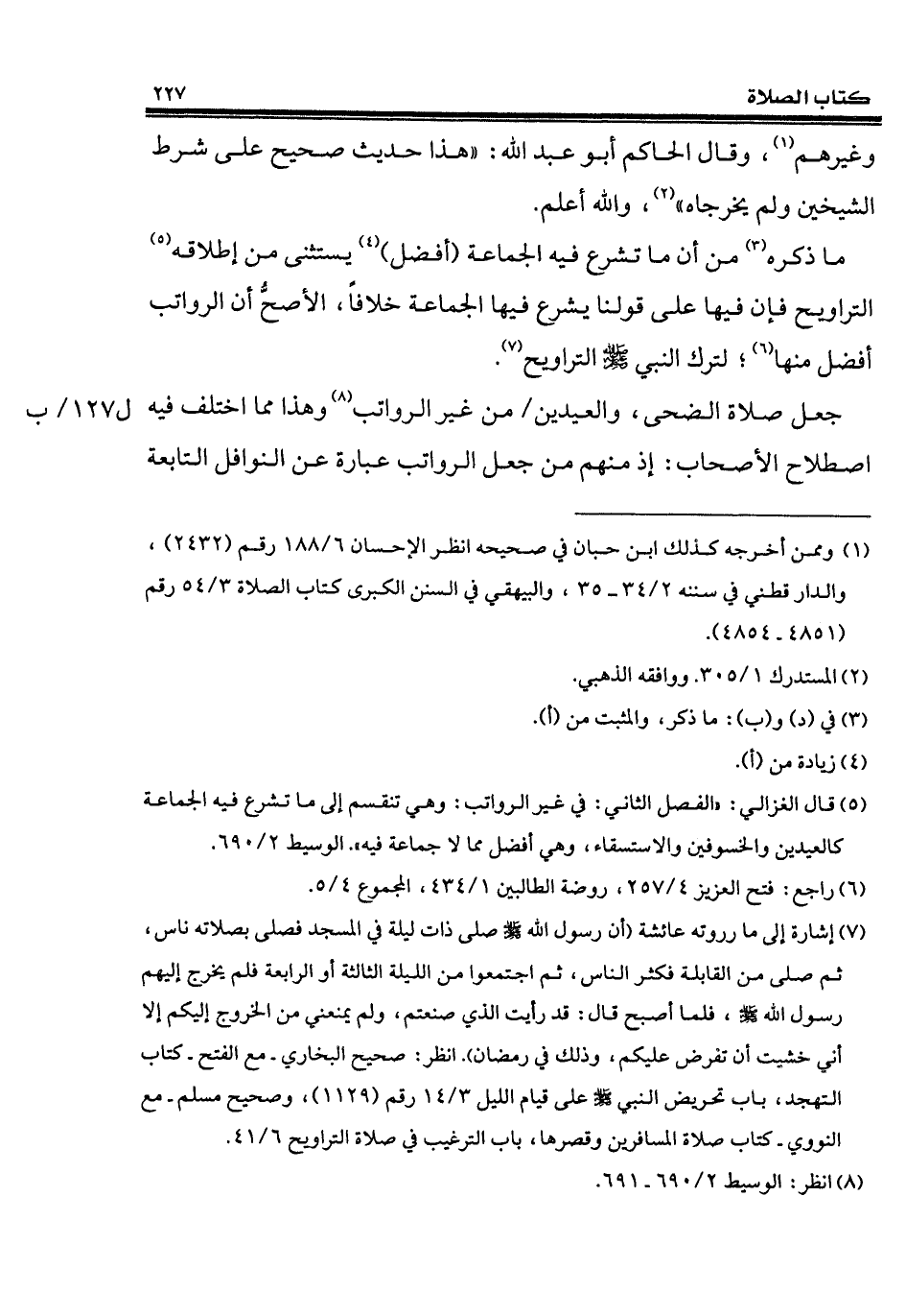 (¬5) قال الغزالي: "الفصل الثاني: في غير الرواتب: وهي تنقسم إلى ما تشرع فيه الجماعة كالعيدين والخسوفين والاستسقاء، وهي أفضل مما لا جماعة فيه". الوسيط 2/ 690.
