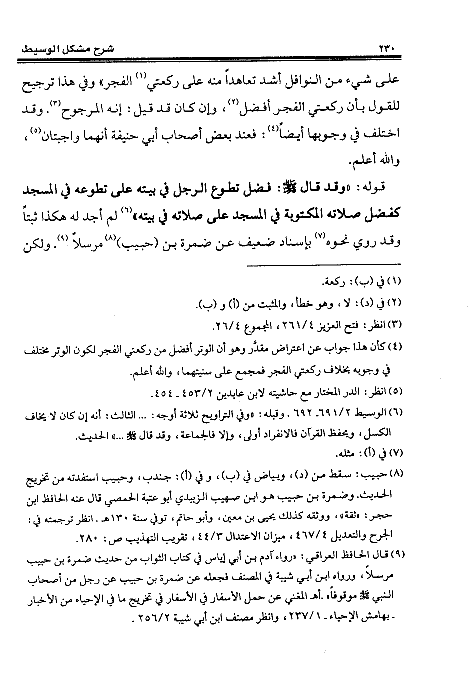 قوله: "وقد قال - صلى الله عليه وسلم -: فضل تطوع الرجل في بيته على تطوعه في المسجد كفضل صلاته المكتوبة في المسجد على صلاته في بيته" (¬6) لم أجد له هكذا ثبتاً وقد روي نحوه (¬7) بإسناد ضعيف عن ضمرة بن (حبيب) (¬8) مرسلاً (¬9). ولكن