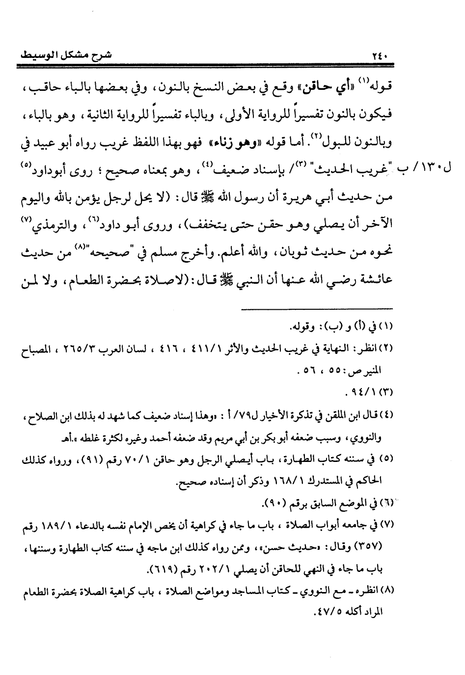 قوله (¬1) "أي حاقن" وقع في بعض النسخ بالنون، وفي بعضها بالباء حاقب، فيكون بالنون تفسيراً للرواية الأولى، وبالباء تفسيراً للرواية الثانية، وهو بالباء، وبالنون للبول (¬2). أما قوله "وهو زناء" فهو بهذا اللفظ غريب رواه أبو عبيد في "غريب الحديث" (¬3) بإسناد ضعيف (¬4)، وهو بمعناه صحيح؛ روى أبو داود (¬5) من حديث أبي هريرة أن رسول الله - صلى الله عليه وسلم - قال: (لا يحل لرجل يؤمن بالله واليوم الآخر أن يصلي وهو حقن حتى يتخفف)، وروى أبو داود (¬6)، والترمذي (¬7) نحوه من حديث ثوبان، والله أعلم. وأخرج مسلم في "صحيحه" (¬8) من حديث عائشة رضي الله عنها أن النبي - صلى الله عليه وسلم - قال: (لا صلاة بحضرة الطعام، ولا لمن