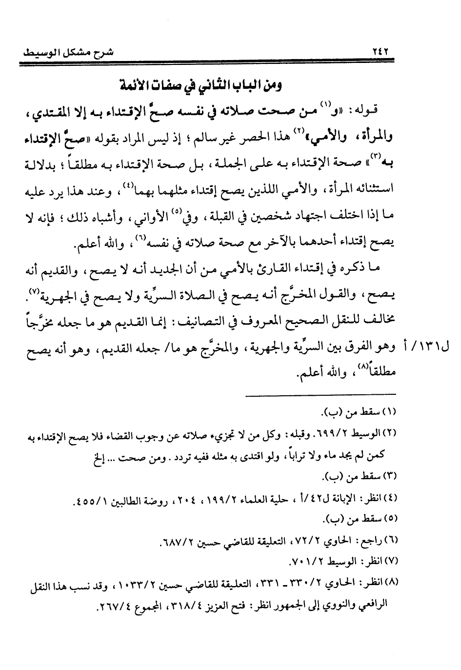 (¬2) الوسيط 2/ 699. وقبله: وكل من لا تجزيء صلاته عن وجوب القضاء فلا يصح الإقتداء به كمن لم يجد ماء ولا تراباً، ولو اقتدى به مثله ففيه تردد. ومن صحت ... إلخ