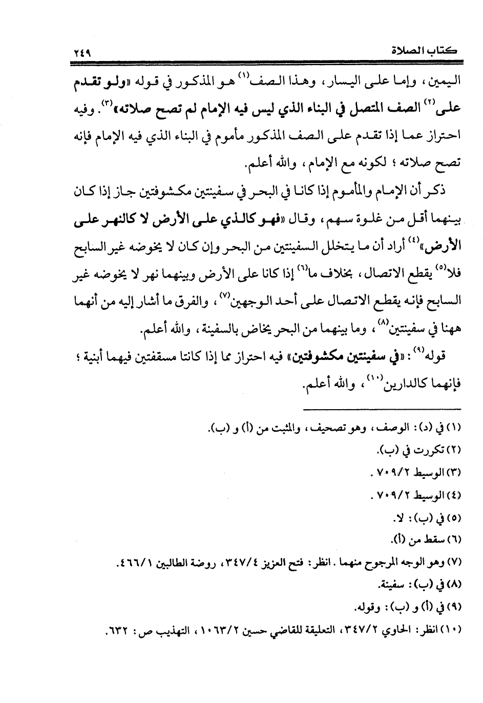 ذكر أن الإمام والمأموم إذا كانا في البحر في سفينتين مكشوفتين جاز إذا كان بينهما أقل من غلوة سهم، وقال "فهو كالذي على الأرض لا كالنهر على الأرض" (¬4) أراد أن ما يتخلل السفينتين من البحر وإن كان لا يخوضه غير السابح فلا (¬5) يقطع الاتصال, بخلاف ما (¬6) إذا كانا على الأرض وبينهما نهر لا يخوضه غير السابح فإنه يقطع الاتصال على أحد الوجهين (¬7) والفرق ما أشار إليه من أنهما ههنا في سفينتين (¬8)، وما بينهما من البحر يخاض بالسفينة, والله أعلم.