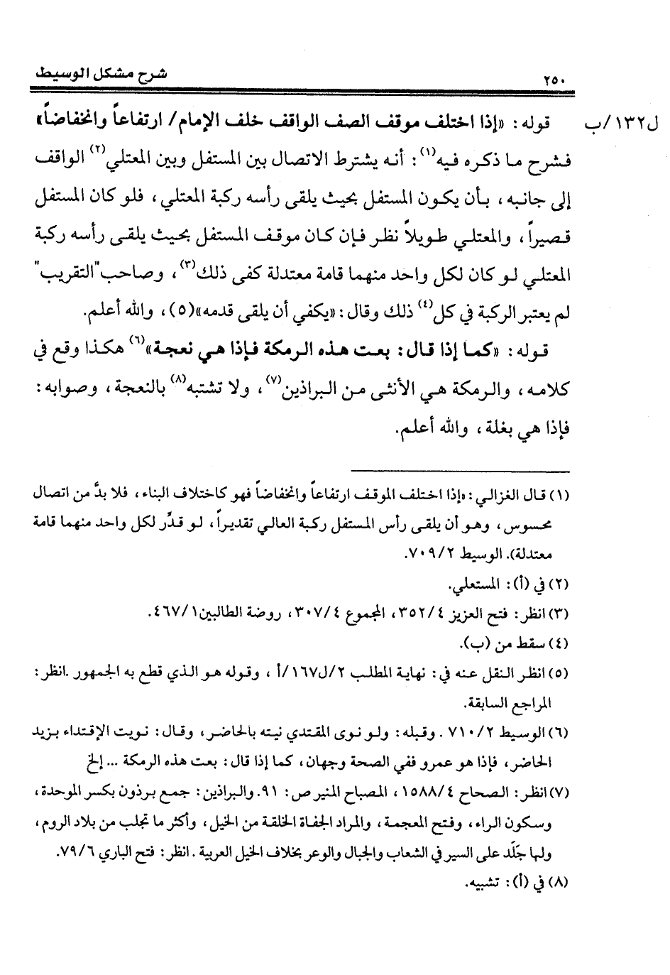 (¬1) قال الغزالي: "إذا اختلف الموقف ارتفاعاً وانخفاضاً فهو كاختلاف البناء، فلا بدَّ من اتصال محسوس، وهو أن يلقى رأس المستفل ركبة العالي تقديراً، لو قدِّر لكل واحد منهما قامة معتدلة). الوسيط 2/ 709.