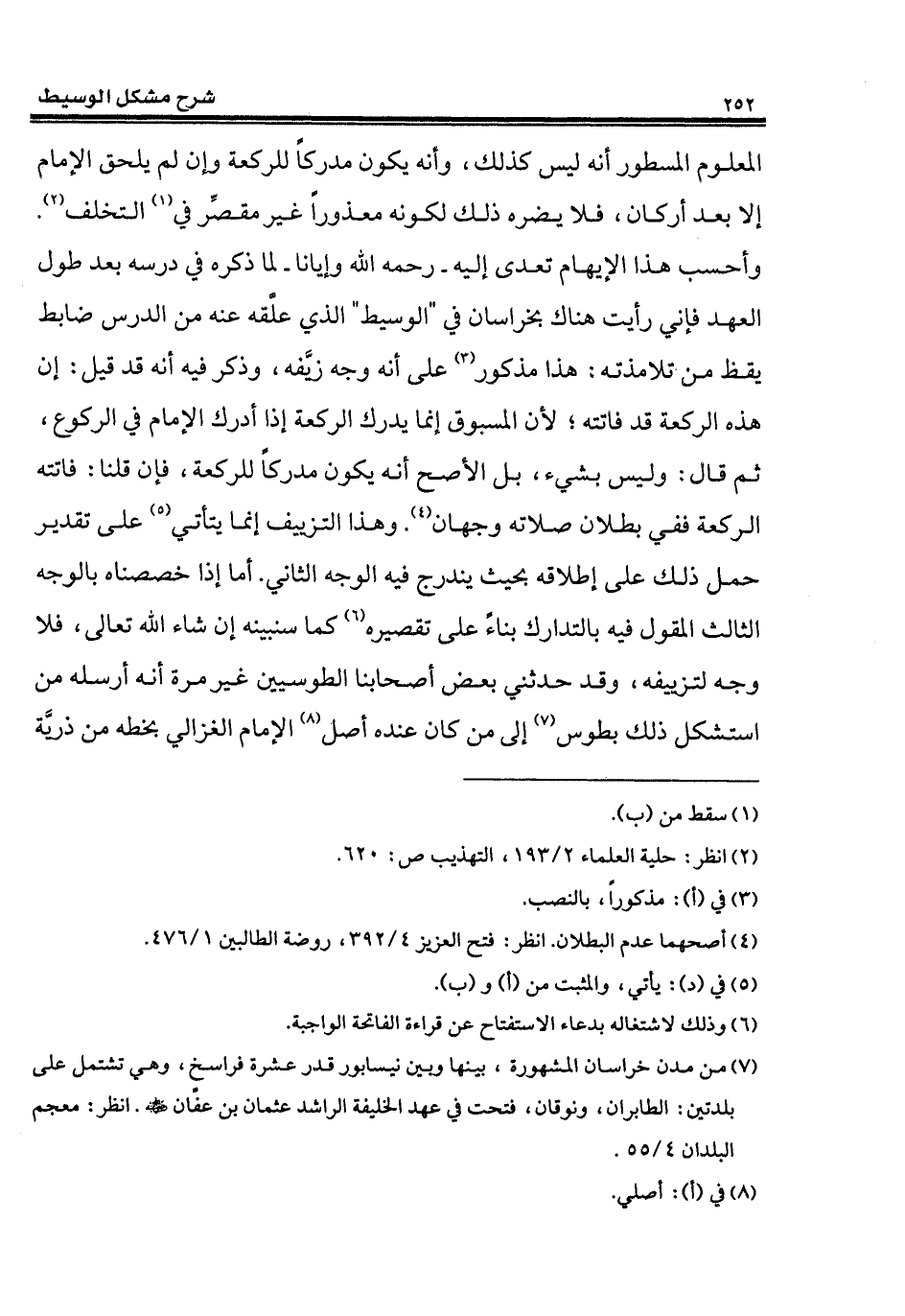 المعلوم المسطور أنه ليس كذلك، وأنه يكون مدركاً للركعة وإن لم يلحق الإمام إلا بعد أركان، فلا يضره ذلك لكونه معذوراً غير مقصِّر في (¬1) التخلف (¬2). وأحسب هذا الإيهام تعدى إليه - رحمه الله وإيانا - لما ذكره في درسه بعد طول العهد فإني رأيت هناك بخراسان في "الوسيط" الذي علَّقه عنه من الدرس ضابط يقظ من تلامذته: هذا مذكور (¬3) على أنه وجه زيَّفه، وذكر فيه أنه قد قيل: إن هذه الركعة قد فاتته؛ لأن المسبوق إنما يدرك الركعة إذا أدرك الإمام في الركوع، ثم قال: وليس بشيء، بل الأصح أنه يكون مدركاً للركعة، فإن قلنا: فاتته الركعة ففي بطلان صلاته وجهان (¬4). وهذا التزييف إنما يتأتي (¬5) على تقدير حمل ذلك على إطلاقه بحيث يندرج فيه الوجه الثاني. أما إذا خصصناه بالوجه الثالث القول فيه بالتدارك بناءً على تقصيره (¬6) كما سنبينه إن شاء الله تعالى، فلا وجه لتزييفه، وقد حدثني بعض أصحابنا الطوسيين غير مرة أنه أرسله من استشكل ذلك بطوس (¬7) إلى من كان عنده أصل (¬8) الإمام الغزالي بخطه من ذريَّة