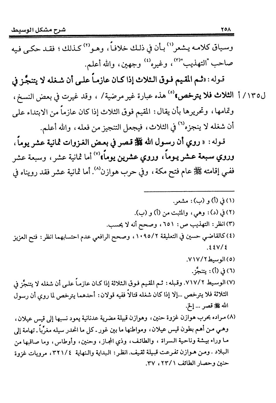 قوله: "ثم المقيم فوق الثلاث إذا كان عازماً على أن شغله لا يتنجَّز في الثلاث فلا يترخص" (¬5) هذه عبارة غير مرضية، وقد غيرت في بعض النسخ، وتمامها، وتحريرها بأن يقال: المقيم فوق الثلاث إذا كان عازماً من الابتداء على أن شغله لا ينجزه (¬6) في الثلاث، فيجعل التنجيز من فعله، والله أعلم.
