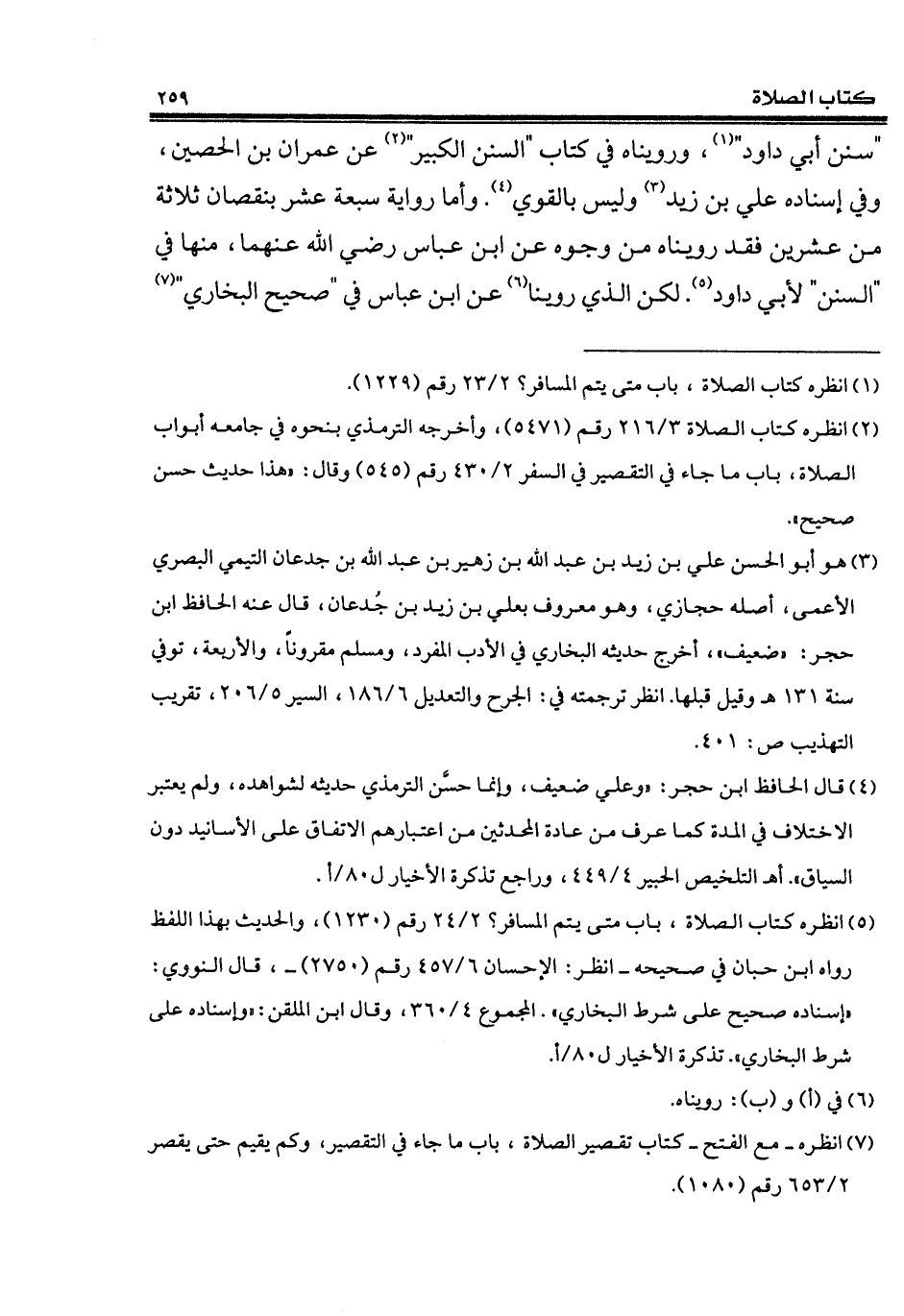 (¬2) انظره كتاب الصلاة 3/ 216 رقم (5471)، وأخرجه الترمذي بنحوه في جامعه أبواب الصلاة، باب ما جاء في التقصير في السفر 2/ 430 رقم (545) وقال: "هذا حديث حسن صحيح".