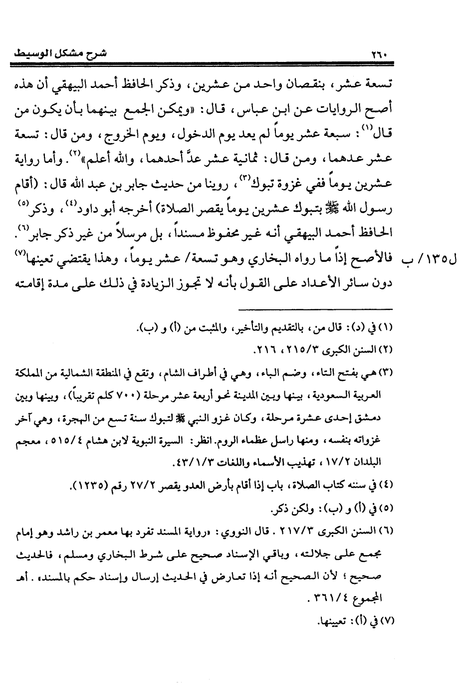 تسعة عشر، بنقصان واحد من عشرين، وذكر الحافظ أحمد البيهقي أن هذه أصح الروايات عن ابن عباس، قال: "ويمكن الجمع بينهما بأن يكون من قال (¬1): سبعة عشر يوماً لم يعد يوم الدخول، ويوم الخروج، ومن قال: تسعة عشر عدهما، ومن قال: ثمانية عشر عدَّ أحدهما، والله أعلم" (¬2). وأما رواية عشرين يوماً ففي غزوة تبوك (¬3)، روينا من حديث جابر بن عبد الله قال: (أقام رسول الله - صلى الله عليه وسلم - بتبوك عشرين يوماً يقصر الصلاة) أخرجه أبو داود (¬4)، وذكر (¬5) الحافظ أحمد البيهقي أنه غير محفوظ مسنداً، بل مرسلاً من غير ذكر جابر (¬6). فالأصح إذاً ما رواه البخاري وهو تسعة عشر يوماً، وهذا يقتضي تعينها (¬7) دون سائر الأعداد على القول بأنه لا تجوز الزيادة في ذلك على مدة إقامته