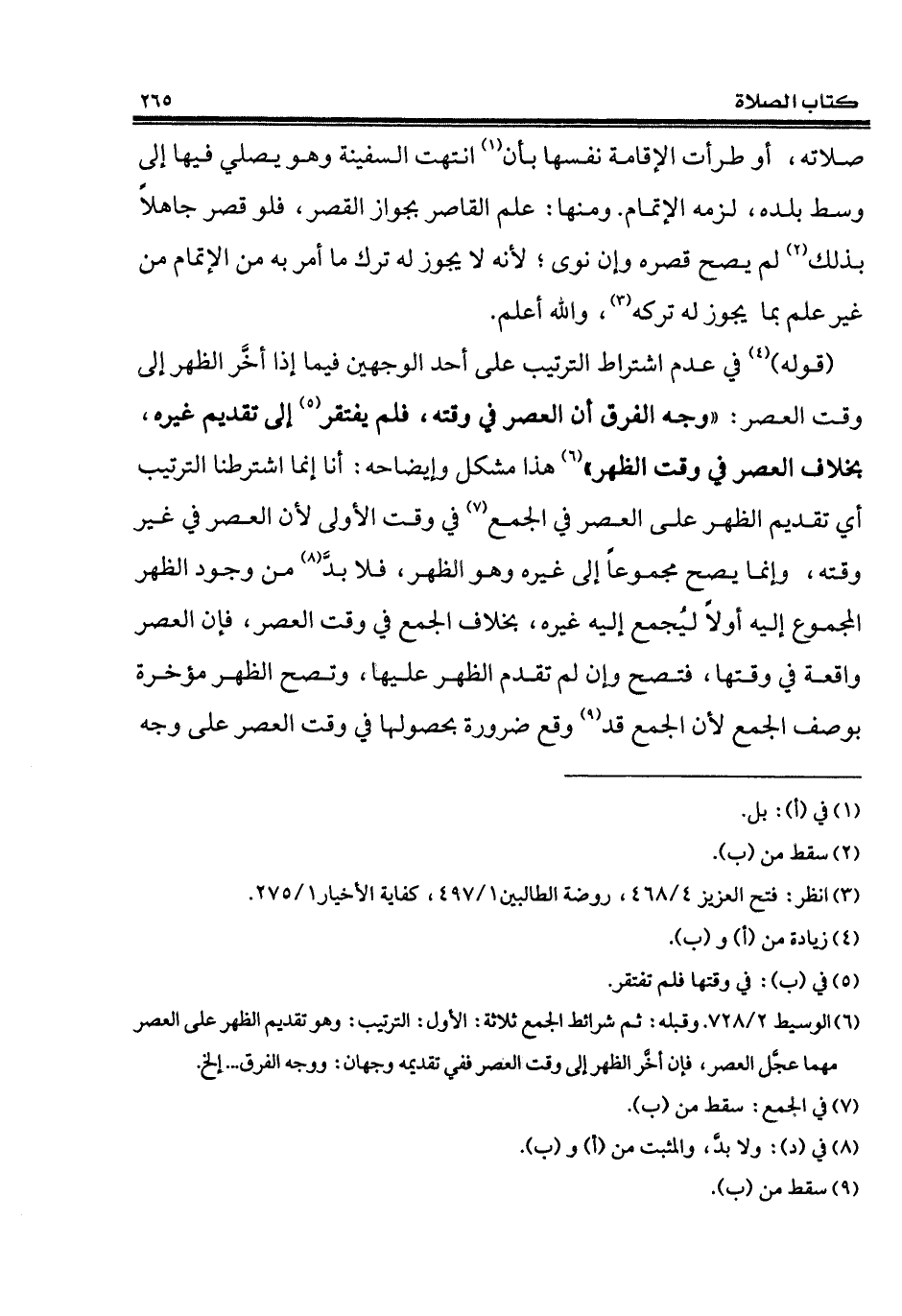(¬6) الوسيط 2/ 728. وقبله: ثم شرائط الجمع ثلاثة: الأول: الترتيب: وهو تقديم الظهر على العصر مهما عجَّل العصر، فإن أخَّر الظهر إلى وقت العصر ففي تقديمه وجهان: ووجه الفرق ... إلخ.