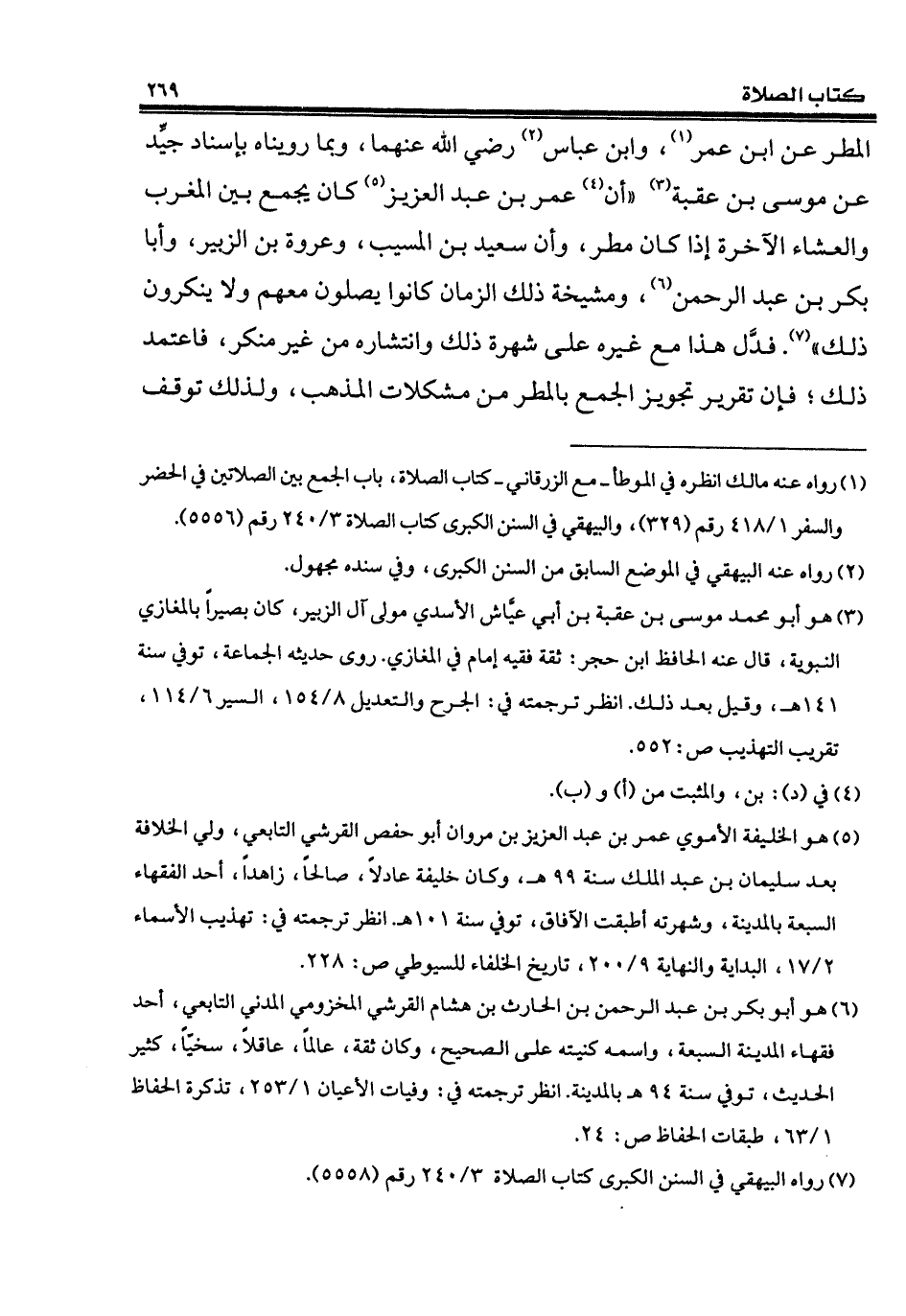 (¬1) رواه عنه مالك انظره في الموطأ - مع الزرقاني - كتاب الصلاة، باب الجمع بين الصلاتين في الحضر والسفر 1/ 418 رقم (329)، والبيهقي في السنن الكبرى كتاب الصلاة 3/ 240 رقم (5556).