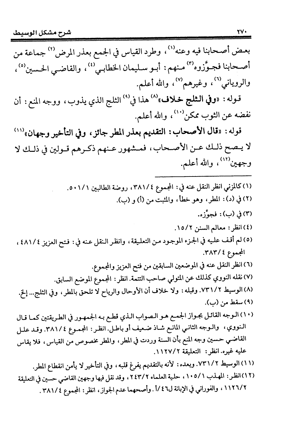 (¬8) الوسيط 2/ 731. وقبله: ولا خلاف أن الأوحال والرياح لا تلحق بالمطر، وفي الثلج ... إلخ.