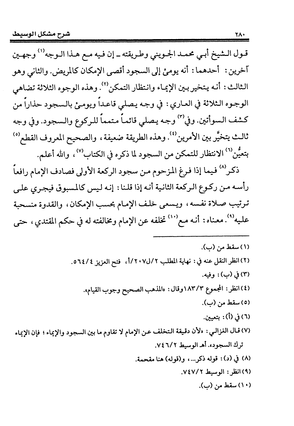 (¬7) قال الغزالي: "لأن دقيقة التخلف عن الإمام لا تقاوم ما بين السجود والإيماء؛ فإن الإيماء ترك السجود". أهـ الوسيط 2/ 746.