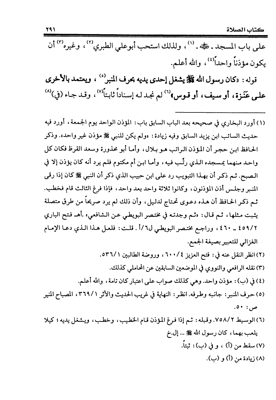 (¬6) الوسيط 2/ 758. وقبله: ثم إذا فرغ المؤذن قام الخطيب، وخطب، ويشغل يديه؛ كيلا يلعب بهما، كان رسول الله - صلى الله عليه وسلم - ... إلخ