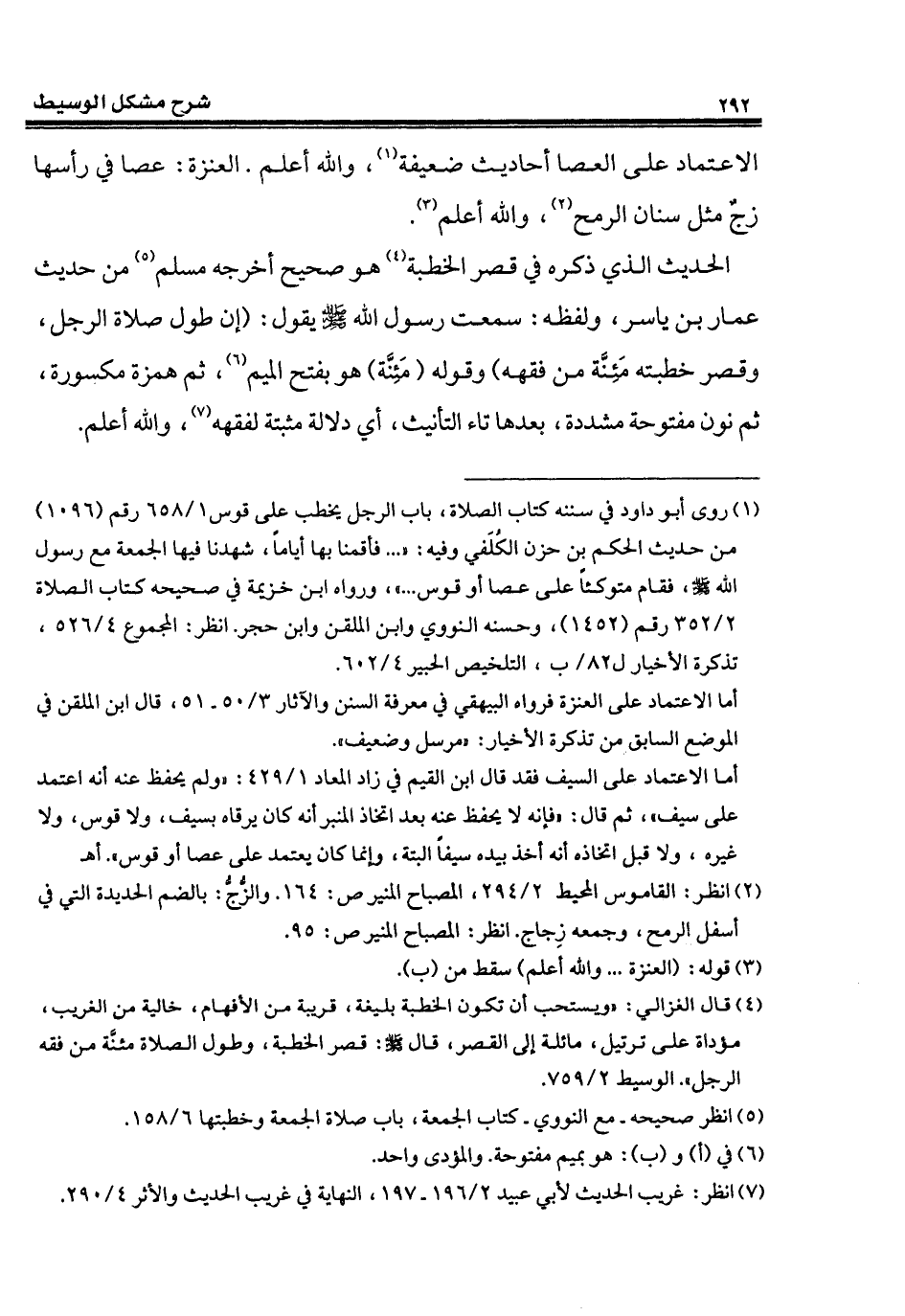 (¬1) روى أبو داود في سننه كتاب الصلاة، باب الرجل يخطب على قوس 1/ 658 رقم (1096) من حديث الحكم بن حزن الكُلَفي وفيه: " ... فأقمنا بها أياماً، شهدنا فيها الجمعة مع رسول الله - صلى الله عليه وسلم -، فقام متوكئاً على عصا أو قوس ... ", ورواه ابن خزيمة في صحيحه كتاب الصلاة 2/ 352 رقم (1452)، وحسنه النووي وابن الملقن وابن حجر. انظر: المجموع 4/ 526، تذكرة الأخيار ل82/ ب، التلخيص الحبير 4/ 602.