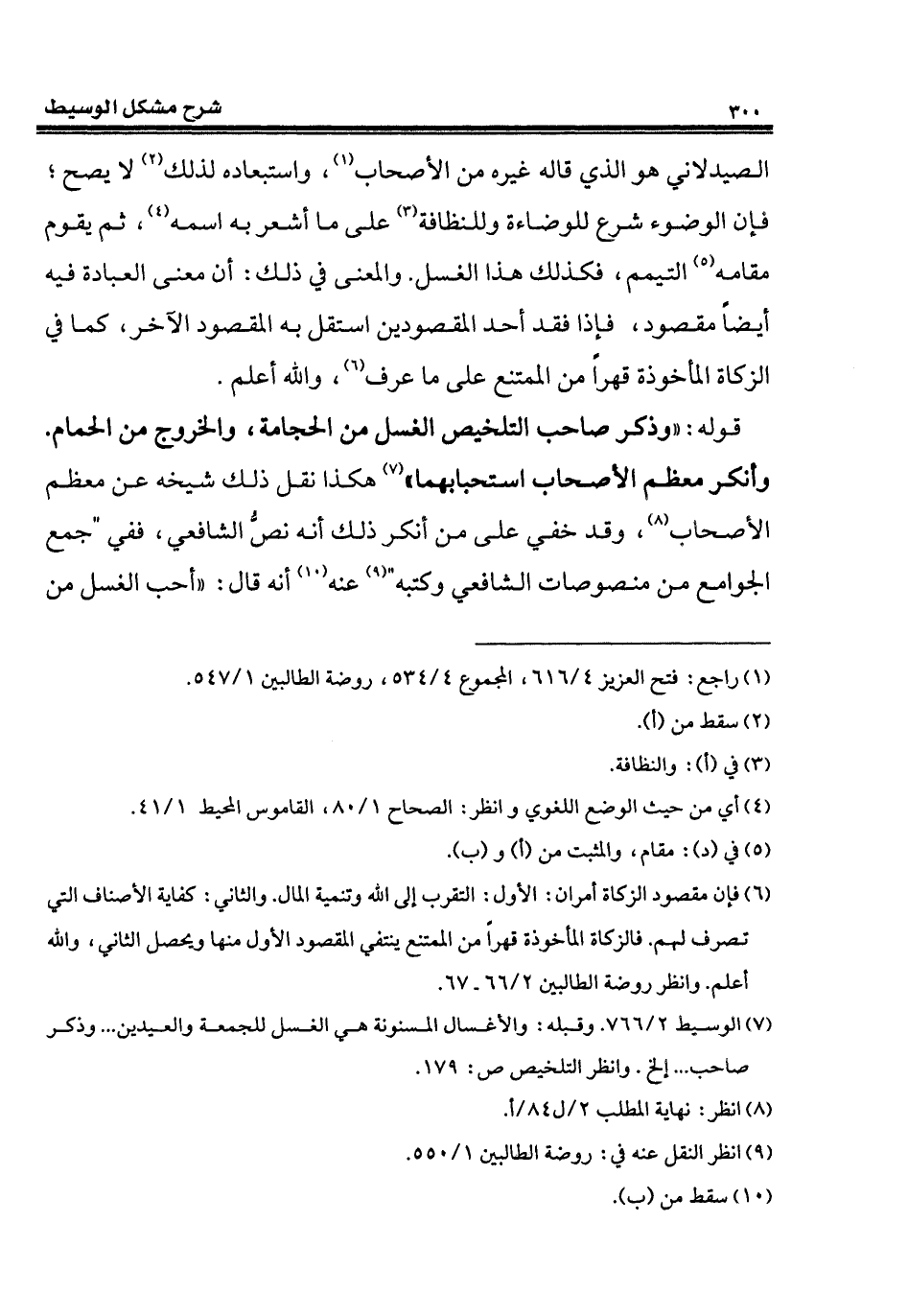 (¬7) الوسيط 2/ 766. وقبله: والأغسال المسنونة هي الغسل للجمعة والعيدين ... وذكر صاحب ... إلخ. وانظر التلخيص ص: 179.