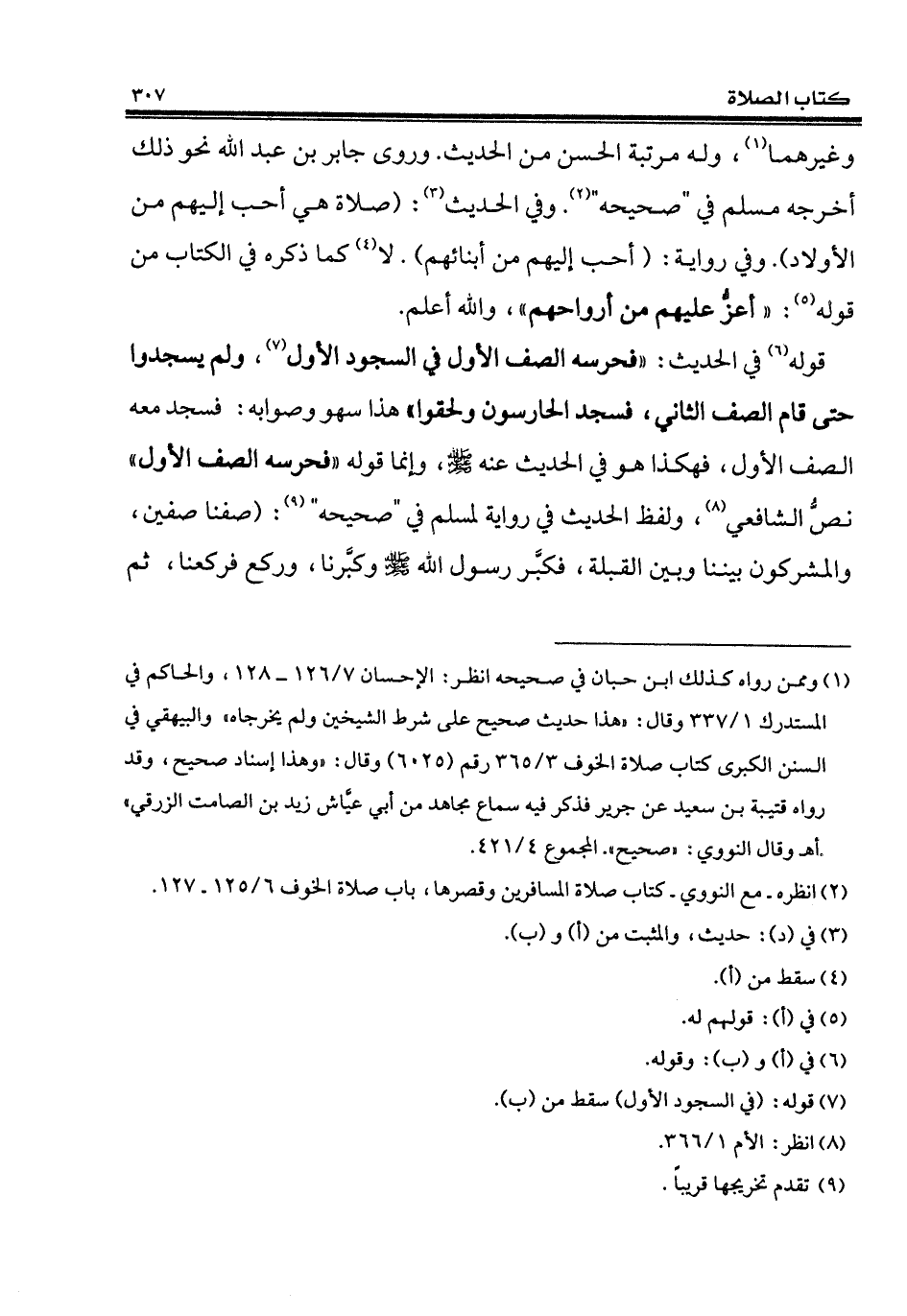 قوله (¬6) في الحديث: "فحرسه الصف الأول في السجود الأول (¬7)، ولم يسجدوا حتى قام الصف الثاني، فسجد الحارسون ولحقوا" هذا سهو وصوابه: فسجد معه الصف الأول، فهكذا هو في الحديث عنه - صلى الله عليه وسلم -، وإنّما قوله "فحرسه الصف الأول" نصُّ الشافعي (¬8)، ولفظ الحديث في رواية لمسلم في "صحيحه" (¬9): (صفنا صفين، والمشركون بيننا وبين القبلة، فكبَّر رسول الله - صلى الله عليه وسلم - وكبَّرنا، وركع فركعنا، ثم