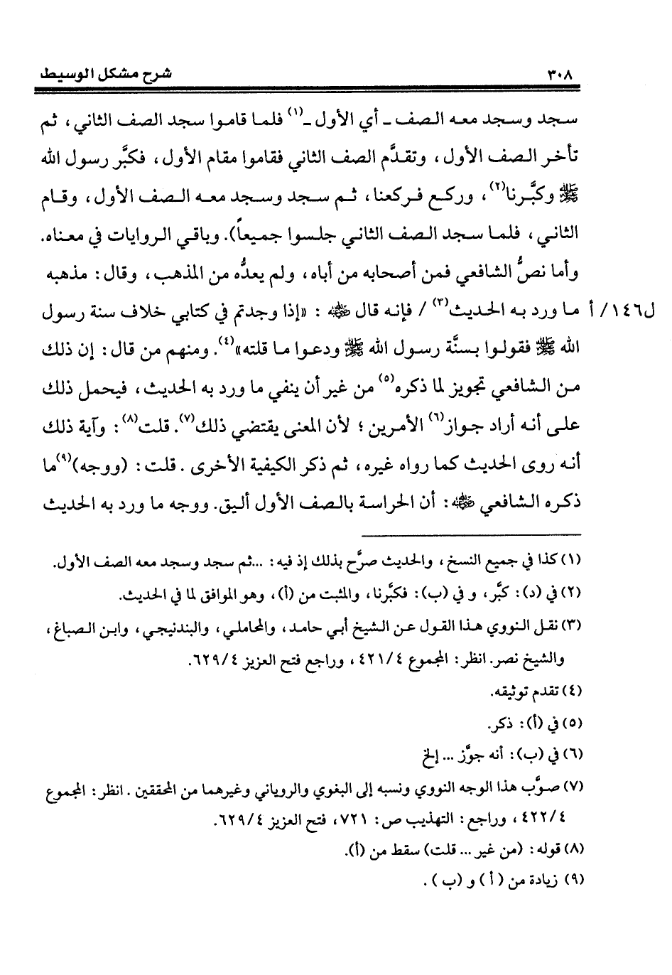 سجد وسجد معه الصف - أي الأول - (¬1) فلما قاموا سجد الصف الثاني، ثم تأخر الصف الأول، وتقدَّم الصف الثاني فقاموا مقام الأول، فكبَّر رسول الله - صلى الله عليه وسلم - وكبَّرنا (¬2)، وركع فركعنا، ثم سجد وسجد معه الصف الأول، وقام الثاني، فلما سجد الصف الثاني جلسوا جميعاً). وباقي الروايات في معناه. وأما نصُّ الشافعي فمن أصحابه من أباه، ولم يعدُّه من المذهب، وقال: مذهبه ما ورد به الحديث (¬3) فإنّه قال - رضي الله عنه -: "إذا وجدتم في كتابي خلاف سنة رسول الله - صلى الله عليه وسلم - فقولوا بسنَّة رسول الله - صلى الله عليه وسلم - ودعوا ما قلته" (¬4). ومنهم من قال: إنَّ ذلك من الشافعي تجويز لما ذكره (¬5) من غير أن ينفي ما ورد به الحديث، فيحمل ذلك على أنّه أراد جواز (¬6) الأمرين؛ لأن المعنى يقتضي ذلك (¬7). قلت (¬8): وآية ذلك أنّه روى الحديث كما رواه غيره، ثم ذكر الكيفية الأخرى. قلت: (ووجه) (¬9) ما ذكره الشافعي - رضي الله عنه -: أن الحراسة بالصف الأول أليق. ووجه ما ورد به الحديث