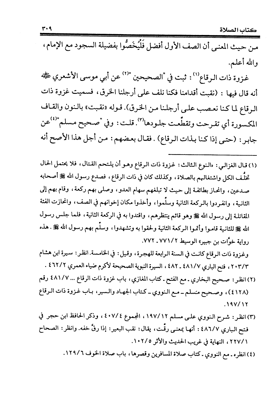 غزوة ذات الرقاع (¬1): ثبت في "الصحيحين" (¬2) عن أبي موسى الأشعري - رضي الله عنه - أنّه قال فيها: (نقبت أقدامنا فكنا نلف على أرجلنا الخرق، فسميت غزوة ذات الرقاع لما كنا نعصب على أرجلنا من الخرق). قوله "نقبت" بالنون والقاف المكسورة أي تقرحت وتقطَّعت جلودها (¬3). قلت: وفي "صحيح مسلم" (¬4) عن جابر: (حتى إذا كنا بذات الرقاع). فقال بعضهم: من أجل هذا الأصح أنّه