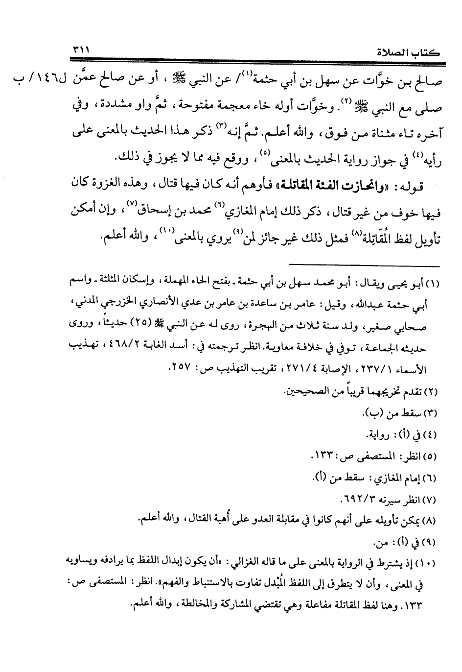 (¬10) إذ يشترط في الرواية بالمعنى على ما قاله الغزالي: "أن يكون إبدال اللفظ بما يرادفه ويساويه في المعنى، وأن لا يتطرق إلى اللفظ المُبْدل تفاوت بالاستنباط والفهم". انظر: المستصفى ص: 133. وهنا لفظ المقاتلة مفاعلة وهي تقتضي المشاركة؛ والمخالطة، والله أعلم.