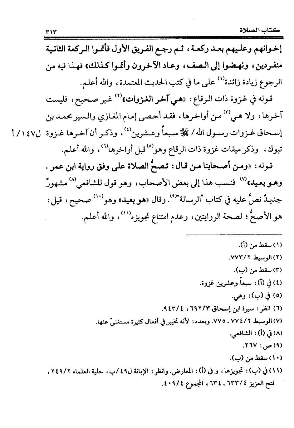 قوله في غزوة ذات الرقاع: "هي آخر الغزوات" (¬2) غير صحيح، فليست آخرها، ولا هي (¬3) من أواخرها، فقد أحصى إمام المغازي والسير محمَّد بن إسحاق غزوات رسول الله - صلى الله عليه وسلم - سبعاً وعشرين (¬4)، وذكر أن آخرها غزوة تبوك، وذكر ميقات غزوة ذات الرقاع وهو (¬5) قبل أواخرها (¬6)، والله أعلم.