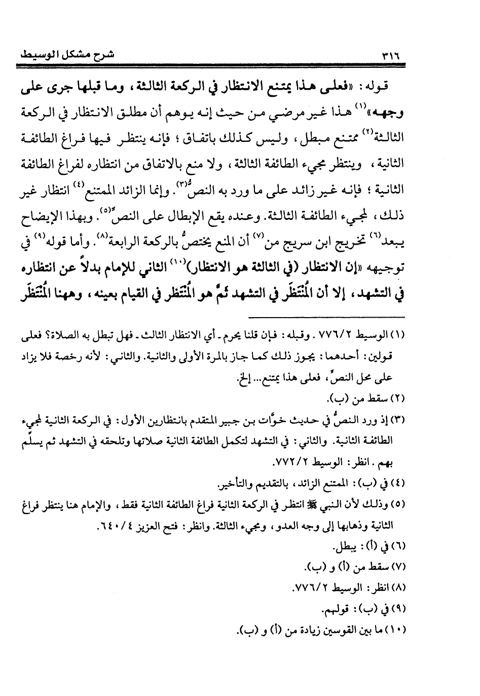 (¬1) الوسيط 2/ 776. وقبله: فإن قلنا يحرم - أي الانتظار الثالث - فهل تبطل به الصلاة؟ فعلى قولين: أحدهما: يجوز ذلك كلما جاز بالمرة الأولى والثانية. والثاني: لأنّه رخصة فلا يزاد على محل النصِّ، فعلى هذا يمتنع ... إلخ.