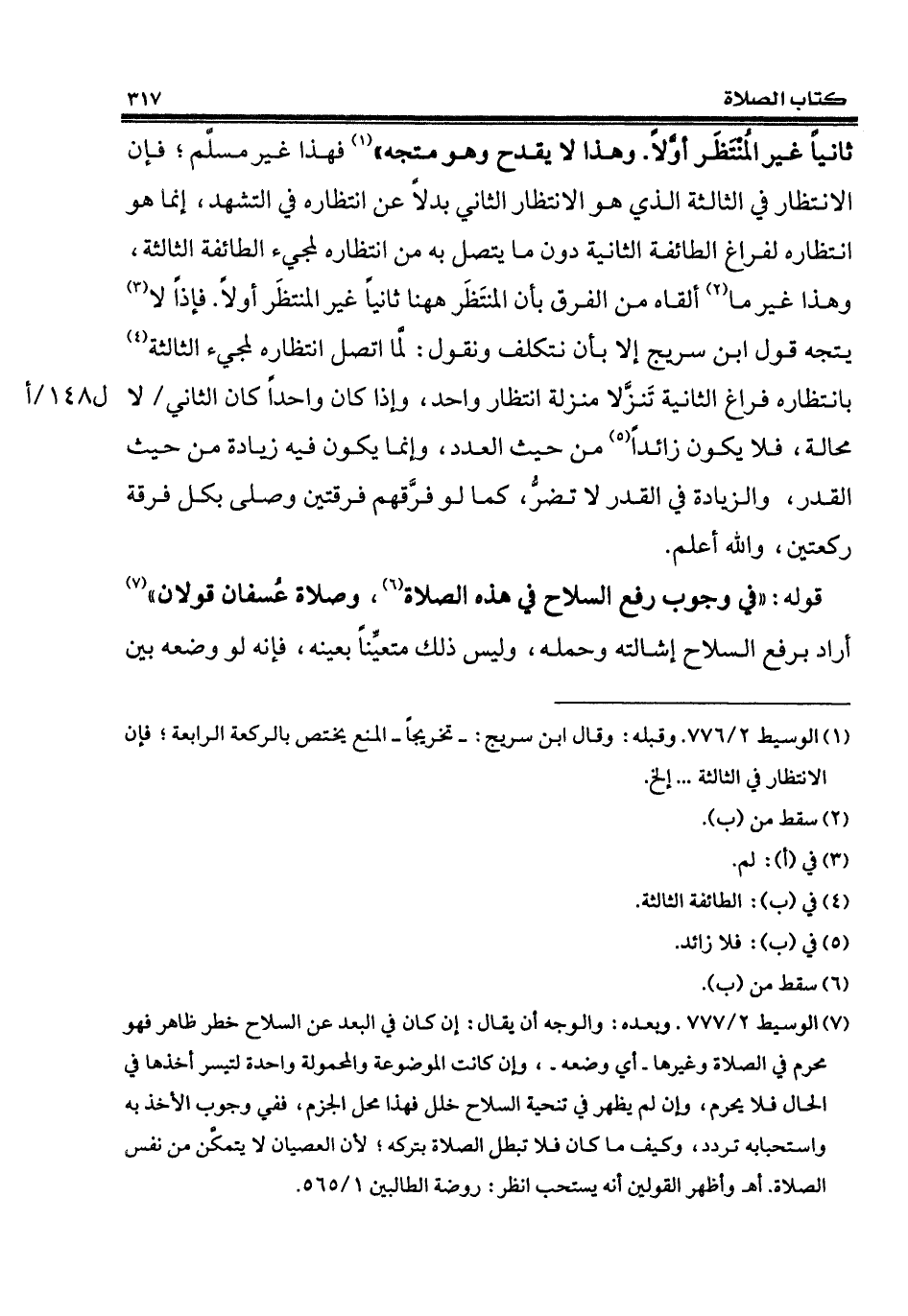 (¬1) الوسيط 2/ 776. وقبله: وقال ابن سريج: - تخريجاً - المنع يختص بالركعة الرابعة؛ فإن الانتظار في الثالثة ... إلخ.