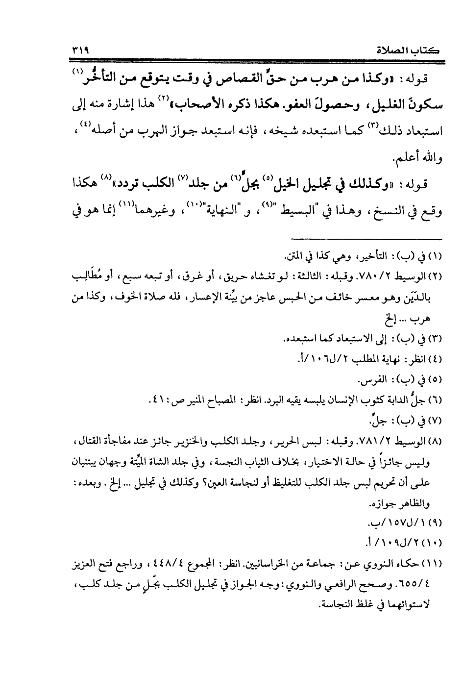 (¬8) الوسيط 2/ 781. وقبله: لبس الحرير، وجلد الكلب والخنزير جائز عند مفاجأة القتال، وليس جائزاً في حالة الاخيار، بخلاف الثياب النجسة، وفي جلد الشاة الميِّتة وجهان يبتنيان علا أن تحريم لبس جلد الكلب للتغليظ أو لنجاسة العين؟ وكذلك في تجليل ... إلخ. وبعده: والظاهر جوازه.