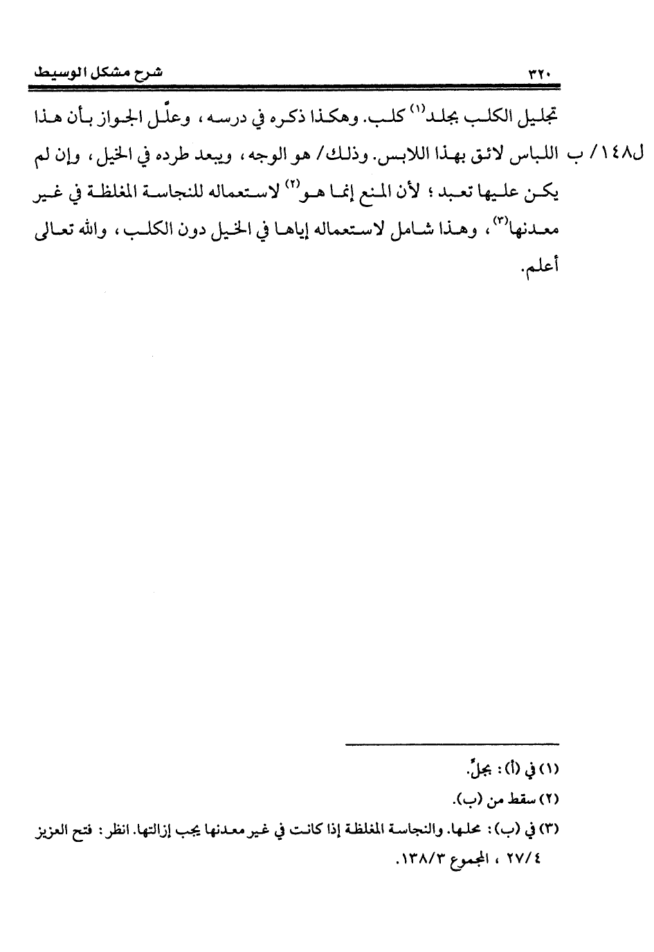 تجليل الكلب بجلد (¬1) كلب. وهكذا ذكره في درسه، وعلَّل الجواز بأن هذا اللباس لائق بهذا اللابس. وذلك هو الوجه، ويبعد طرده في الخيل، وإن لم يكن عليها تعبد؛ لأن المنع إنّما هو (¬2) لاستعماله للنجاسة المغلظة في غير معدنها (¬3)، وهذا شامل لاستعماله إياها في الخيل دون الكلب، والله تعالى أعلم.