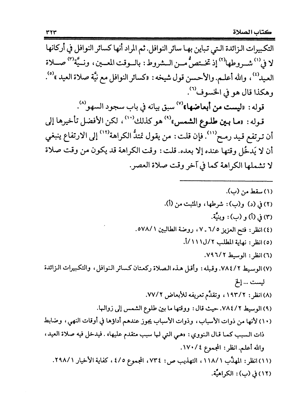التكبيرات الزائدة التي تباين بها سائر النوافل. ثم المراد أنّها كسائر النوافل في أركانها لا في (¬1) شروطها (¬2) إذ تختصُّ من الشروط: بالوقت المعين، ونيَّة (¬3) صلاة العيد (¬4)، والله أعلم. والأحسن قول شيخه: "كسائر النوافل مع نيَّة صلاة العيد" (¬5). وهكذا قال هو فى الخسوف (¬6).