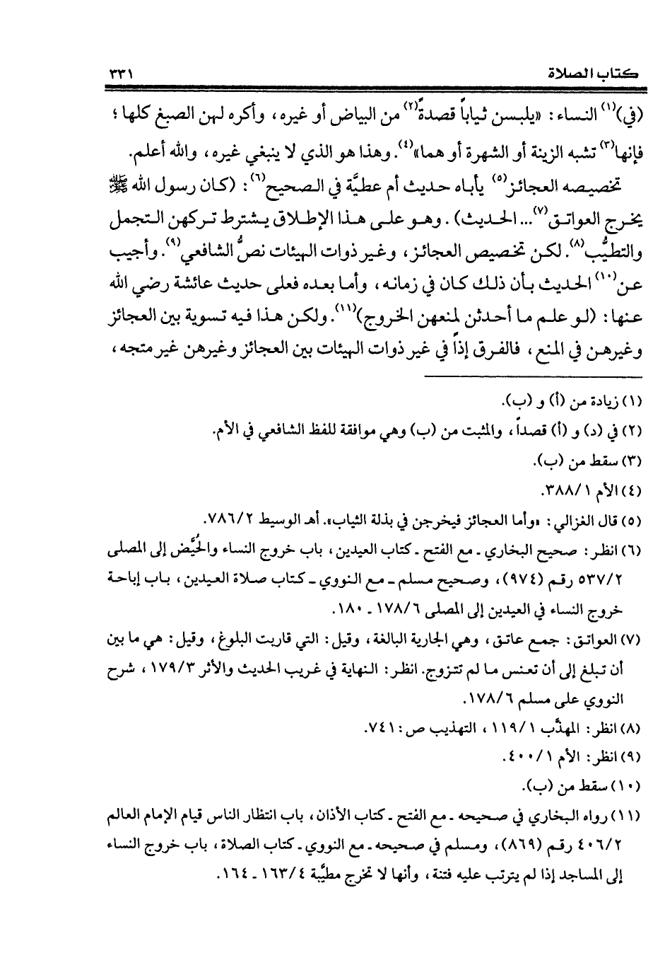 تخصيصه العجائز (¬5) يأباه حديث أم عطيَّة في الصحيح (¬6): (كان رسول الله - صلى الله عليه وسلم - يخرج العواتق (¬7) ... الحديث). وهو على هذا الإطلاق يشترط تركهن التجمل والتطيُّب (¬8). لكن تخصيص العجائز، وغير ذوات الهيئات نصُّ الشافعي (¬9). وأجيب عن (¬10) الحديث بأن ذلك كان في زمانه، وأمّا بعده فعلى حديث عائشة رضي الله عنها: (لو علم ما أحدثن لمنعهن الخروج) (¬11). ولكن هذا فيه تسوية بين العجائز وغيرهن في المنع، فالفرق إذاً في غير ذوات الهيئات بين العجائز وغيرهن غير متجه،
