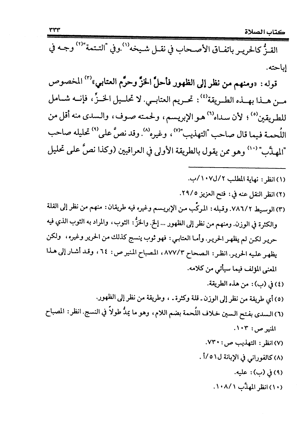 (¬3) الوسيط 2/ 786. وقبله: المركَّب من الإبريسم وغيره فيه طريقان: منهم من نظر إلى القلة والكثرة في الوزن. ومنهم من نظر إلى الظهور ... إلخ. والخزُّ: الثوب، والمراد به الثوب الذي فيه حرير لكن لم يظهر الحرير. وأمّا العتابي: فهو ثوب ينسج كذلك من الحرير وغيره، ولكن يظهر عليه الحرير. انظر: الصحاح 3/ 877، المصباح المنير ص: 64، وقد أشار إلى هذا المعنى المؤلف فيما سيأتي من كلامه.