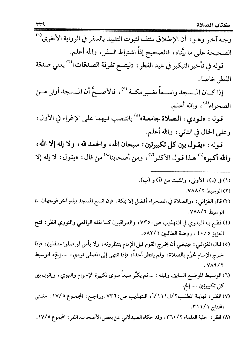 (¬6) الوسيط الموضع السابق. وقبله: ... ثم يكبَّر سبعاً سوى تكبيرة الإحرام والهوي، ويقول بين كل تكبيرتين .... إلخ.