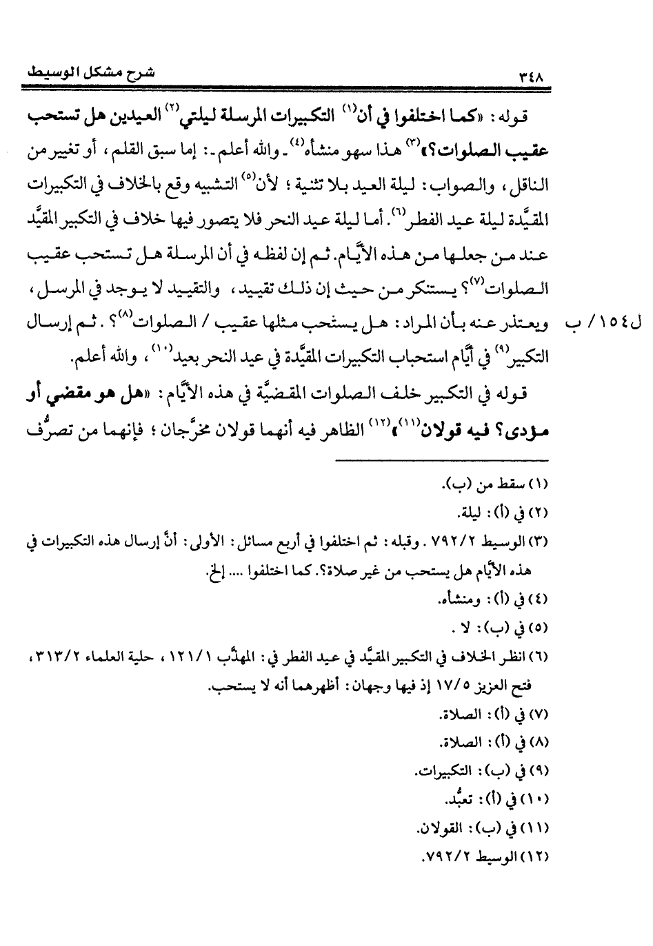 (¬3) الوسيط 2/ 792. وقبله: ثم اختلفوا في أربع مسائل: الأولى: أنَّ إرسال هذه التكبيرات في هذه الأيَّام هل يستحب من غير صلاة؟. كما اختلفوا ... إلخ.