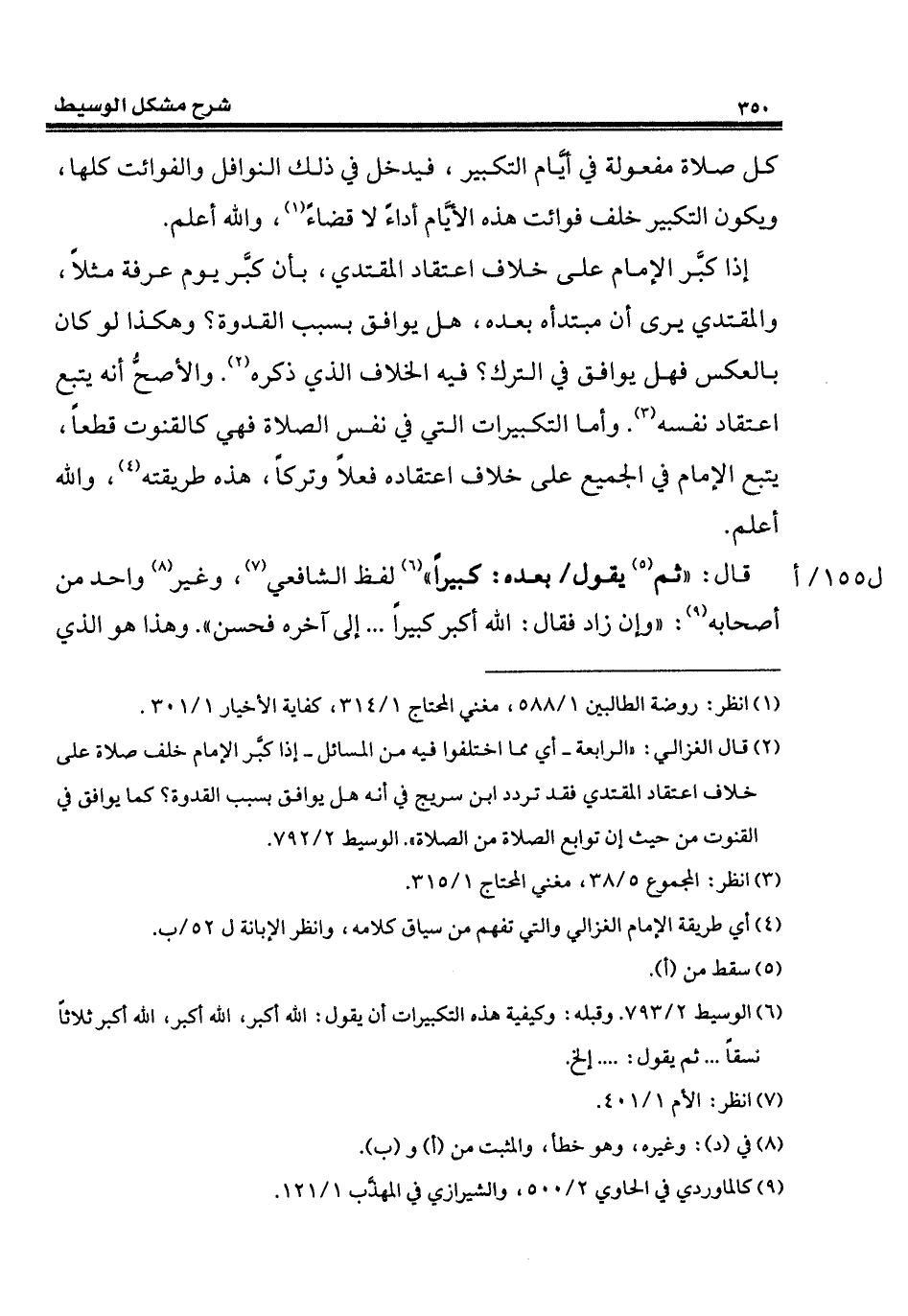 (¬6) الوسيط 2/ 793. وقبله: وكيفية هذه التكبيرات أن يقول: الله أكبر، الله أكبر، الله أكبر ثلاثًا نسقاً .. ثم يقول: .... إلخ.