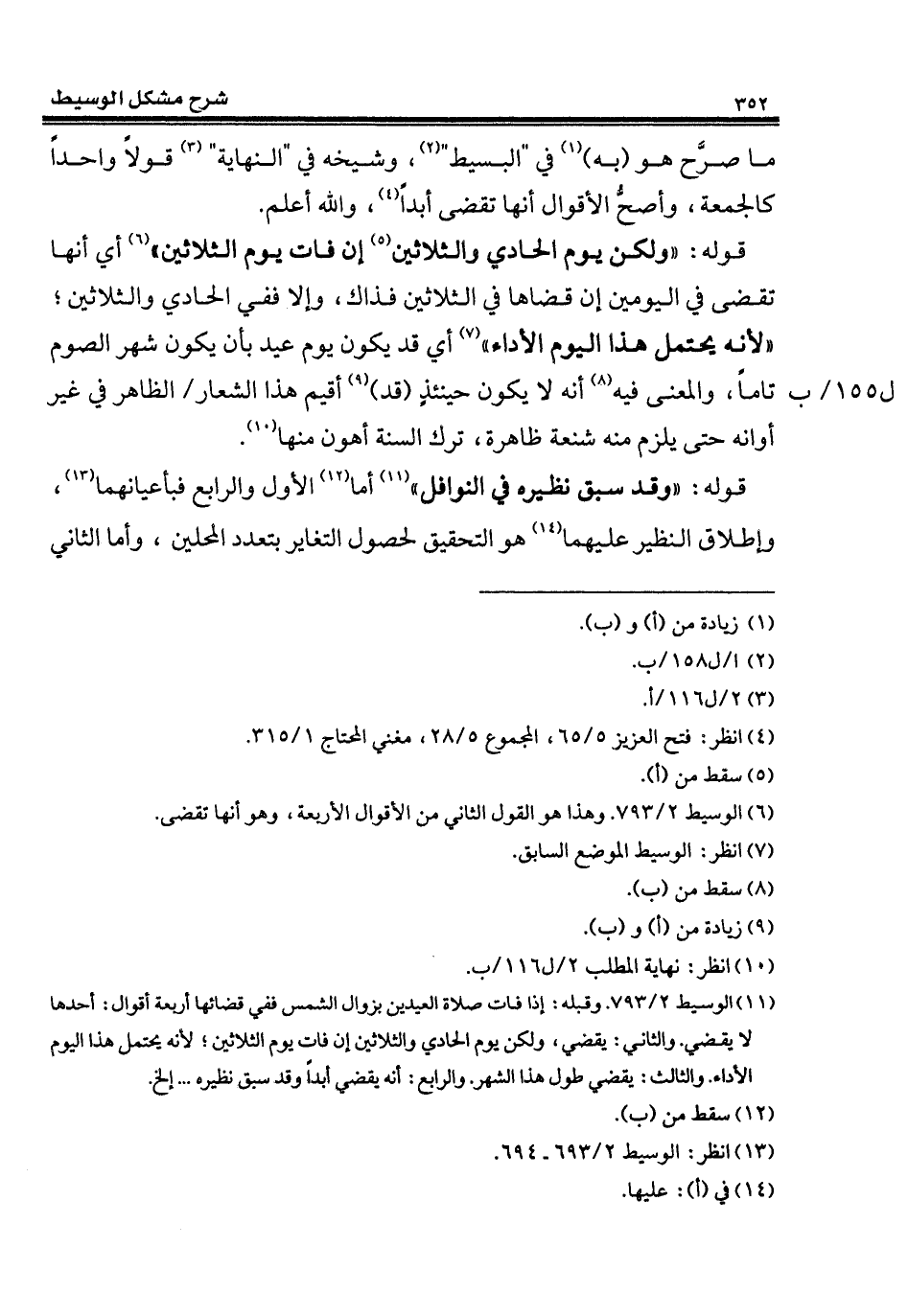 (¬11) الوسيط 2/ 793. وقبله: إذا فات صلاة العيدين بزوال الشمس ففي قضائها أربعة أقوال: أحدها لا يقضي. والثاني: يقضي، ولكن يوم الحادي والثلاثين إن فات يوم الثلاثين؛ لأنه يحتمل هذا اليوم الأداء. والثالث: يقضي طول هذا الشهر. والرابع: أنه يقضي أبداً وقد سبق نظيره ... إلخ.
