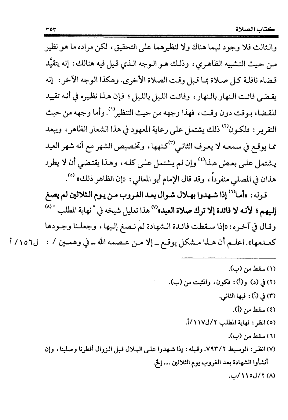 والثالث فلا وجود لهما هناك ولا لنظيرهما على التحقيق، لكن مراده ما هو نظير من حيث التشبيه الظاهري، وذلك هو الوجه الذي قيل فيه هنالك: إنه يتقيَّد قضاء نافلة كل صلاة بما قبل وقت الصلاة الأخرى. وهكذا الوجه الآخر: إنه يقضى فائت النهار بالنهار، وفائت الليل بالليل؛ فإن هذا نظيره في أنه تقييد للقضاء بوقت دون وقت، فهذا وجهه من حيث التنظير (¬1). وأما وجهه من حيث التقرير: فلكون (¬2) ذلك يشتمل على رعاية المعهود في هذا الشعار الظاهر، ويبعد مما يوقع في سمعه لا يعرف الثاني (¬3) كنهها، وتخصيص الشهر مع أنه شهر العيد يشتمل على بعض هذا (¬4) وإن لم يشتمل على كله، وهذا يقتضي أن لا يطرد هذان في المصلي منفرداً، وقد قال الإمام أبو المعالي: "إن الظاهر ذلك" (¬5).