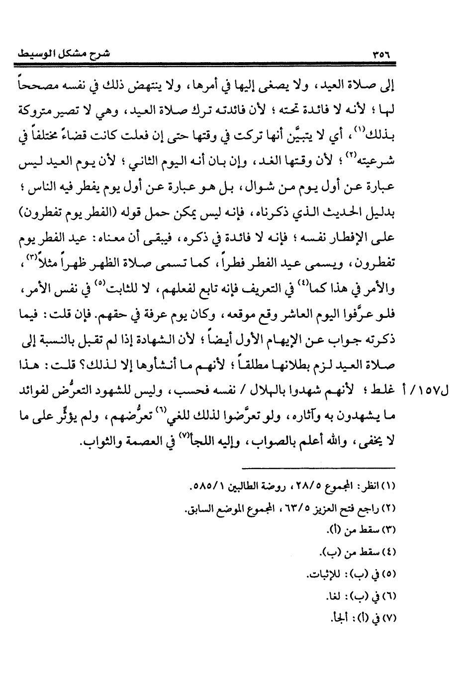 إلى صلاة العيد، ولا يصغى إليها في أمرها، ولا ينتهض ذلك في نفسه مصححاً لها؛ لأنه لا فائدة تحته؛ لأن فائدته ترك صلاة العيد، وهي لا تصير متروكة بذلك (¬1)، أي لا يتبيَّن أنها تركت في وقتها حتى إن فعلت كانت قضاءً مختلفاً في شرعيته (¬2)؛ لأن وقتها الغد، وإن بان أنه اليوم الثاني؛ لأن يوم العيد ليس عبارة عن أول يوم من شوال، بل هو عبارة عن أول يوم يفطر فيه الناس؛ بدليل الحديث الذي ذكرناه، فإنه ليس يمكن حمل قوله (الفطر يوم تفطرون) على الإفطار نفسه؛ فإنه لا فائدة في ذكره، فيبقى أن معناه: عيد الفطر يوم تفطرون، ويسمى عيد الفطر فطراً، كما تسمى صلاة الظهر ظهراً مثلاً (¬3)، والأمر في هذا كما (¬4) في التعريف فإنه تابع لفعلهم، لا للثابت (¬5) في نفس الأمر، فلو عرَّفوا اليوم العاشر وقع موقعه، وكان يوم عرفة في حقهم. فإن قلت: فيما ذكرته جواب عن الإيهام الأول أيضاً؛ لأن الشهادة إذا لم تقبل بالنسبة إلى صلاة العيد لزم بطلانها مطلقاً؛ لأنهم ما أنشأوها إلا لذلك؟ قلت: هذا غلط؛ لأنهم شهدوا بالهلال نفسه فحسب، وليس للشهود التعرُّض لفوائد ما يشهدون به وآثاره، ولو تعرَّضوا لذلك للغي (¬6) تعرُّضهم، ولم يؤثَّر على ما لا يخفى، والله أعلم بالصواب، وإليه اللجأ (¬7) في العصمة والثواب.